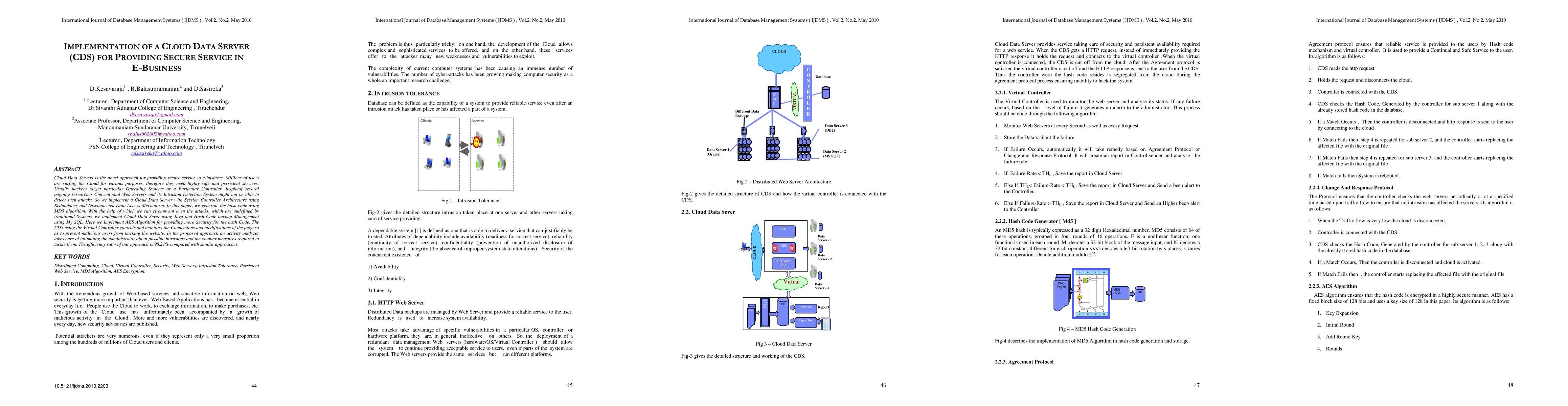 This paper proposes a Cloud Data Server (CDS) to provide secure services for e-business, employing a Session Controller Architecture with redundancy and disconnected data access. The system uses MD5 for hash code generation and AES for enhanced security, achieving a 98.21% efficiency ratio compared to conventional methods.