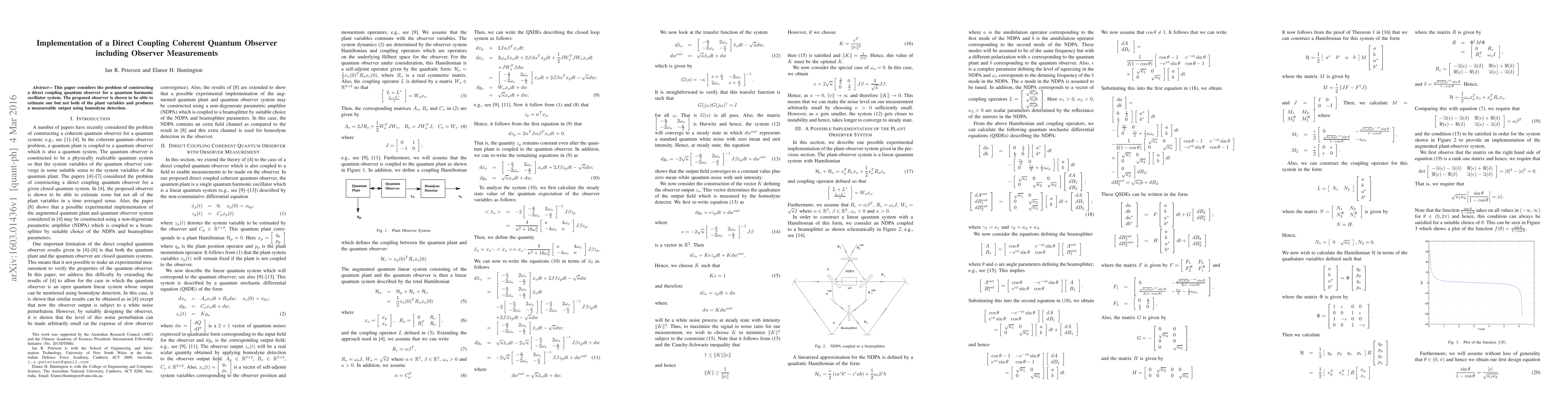 Summary: This paper proposes a direct coupling quantum observer for a quantum harmonic oscillator system that estimates one of the plant variables and generates measurable output via homodyne detection, demonstrating its effectiveness in observer measurements.