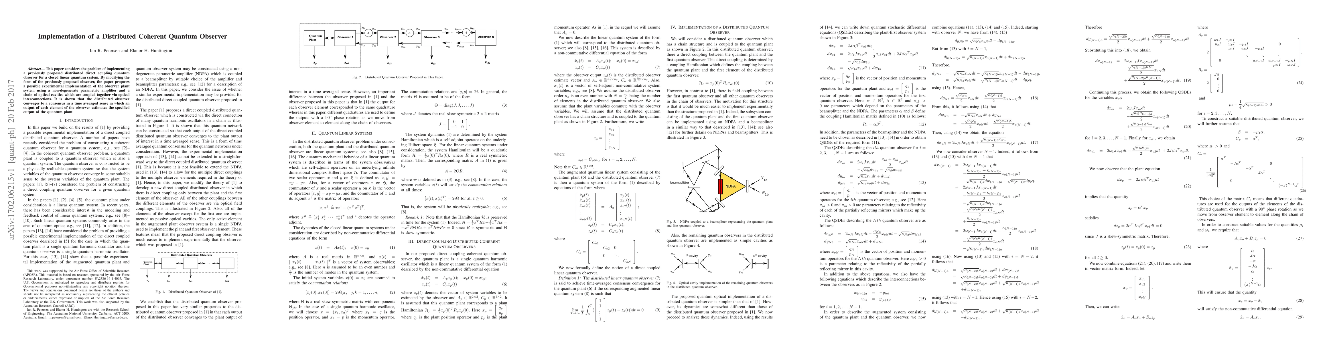 This paper considers the problem of implementing a previously proposed distributed direct coupling quantum observer for a closed linear quantum system. By modifying the form of the previously proposed observer, the paper proposes a possible experimental implementation of the observer plant system using a non-degenerate parametric amplifier and a chain of optical cavities which are coupled together via optical interconnections. It is shown that the distributed observer converges to a consensus in a time averaged sense in which an output of each element of the observer estimates the specified output of the quantum plant.