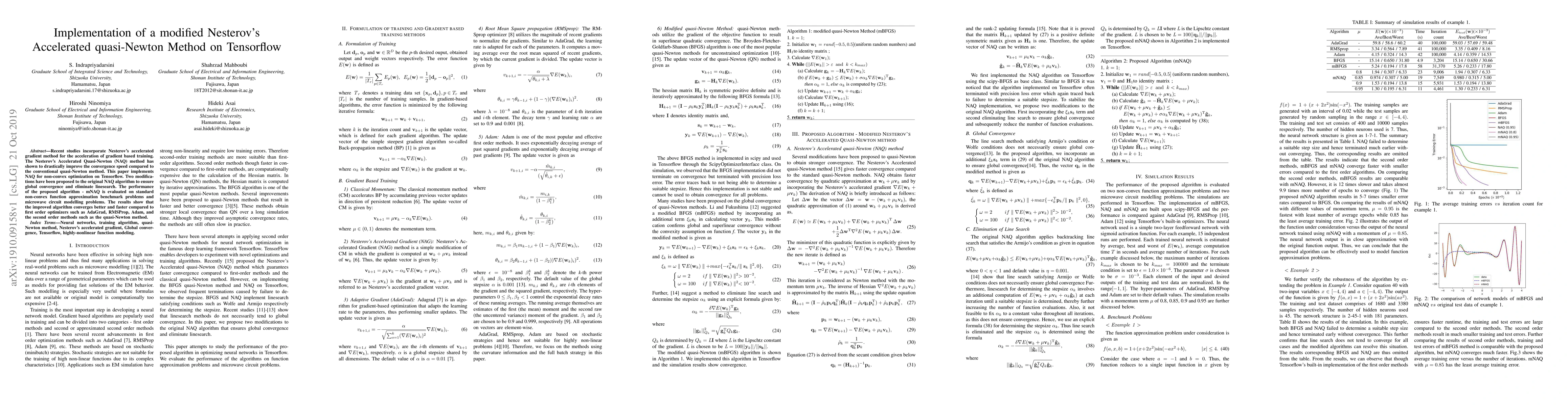 Recent studies incorporate Nesterov's accelerated gradient method for the acceleration of gradient based training. The Nesterov's Accelerated Quasi-Newton (NAQ) method has shown to drastically improve the convergence speed compared to the conventional quasi-Newton method. This paper implements NAQ for non-convex optimization on Tensorflow. Two modifications have been proposed to the original NAQ algorithm to ensure global convergence and eliminate linesearch. The performance of the proposed algorithm - mNAQ is evaluated on standard non-convex function approximation benchmark problems and microwave circuit modelling problems. The results show that the improved algorithm converges better and faster compared to first order optimizers such as AdaGrad, RMSProp, Adam, and the second order methods such as the quasi-Newton method.