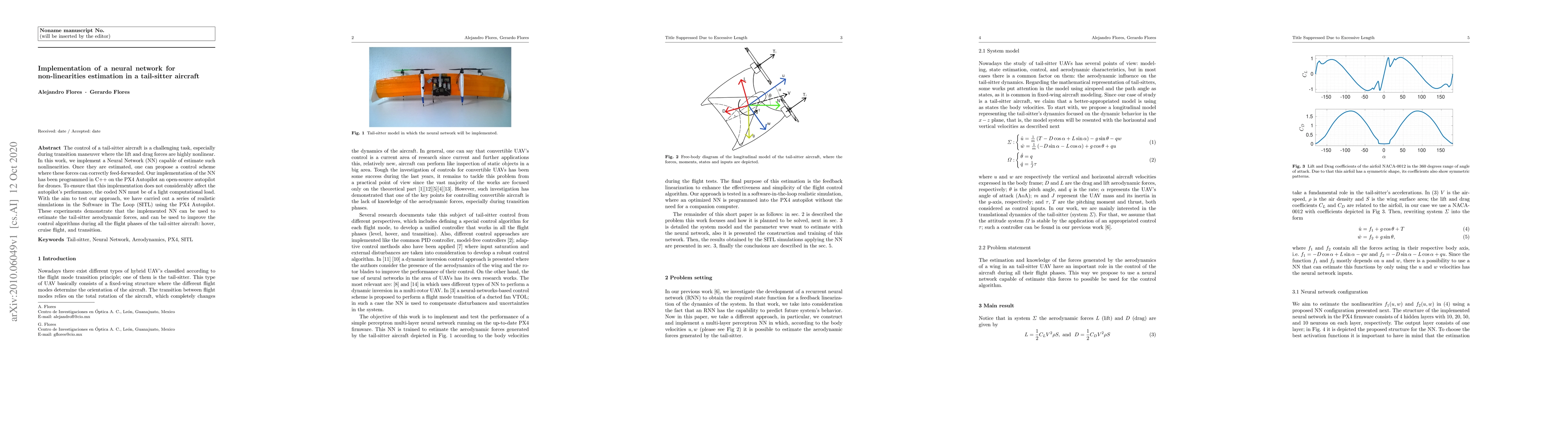 The control of a tail-sitter aircraft is a challenging task, especially during transition maneuver where the lift and drag forces are highly nonlinear. In this work, we implement a Neural Network (NN) capable of estimate such nonlinearities. Once they are estimated, one can propose a control scheme where these forces can correctly feed-forwarded. Our implementation of the NN has been programmed in C++ on the PX4 Autopilot an open-source autopilot for drones. To ensure that this implementation does not considerably affect the autopilot's performance, the coded NN must be of a light computational load. With the aim to test our approach, we have carried out a series of realistic simulations in the Software in The Loop (SITL) using the PX4 Autopilot. These experiments demonstrate that the implemented NN can be used to estimate the tail-sitter aerodynamic forces, and can be used to improve the control algorithms during all the flight phases of the tail-sitter aircraft: hover, cruise flight, and transition.