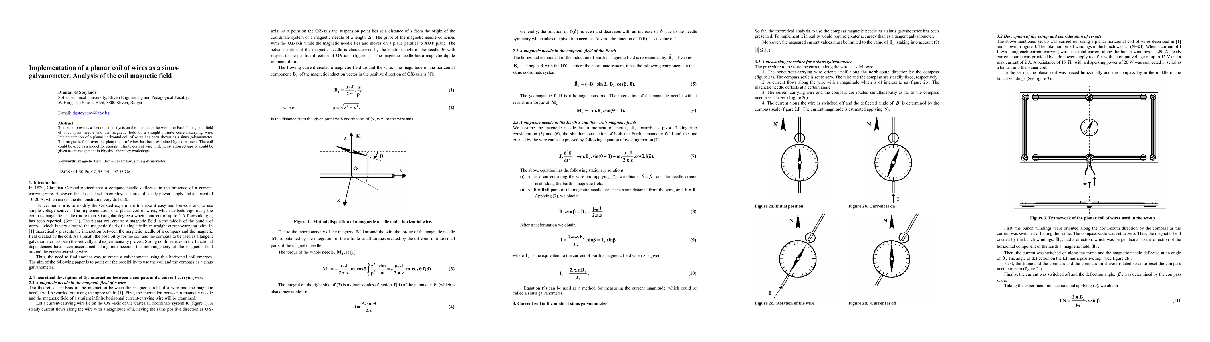 The paper theoretically analyzes the interaction between Earth's magnetic field and a planar coil of wires functioning as a sinus galvanometer, and experimentally examines the coil's magnetic field, suggesting its use in physics demonstrations and laboratory assignments.
