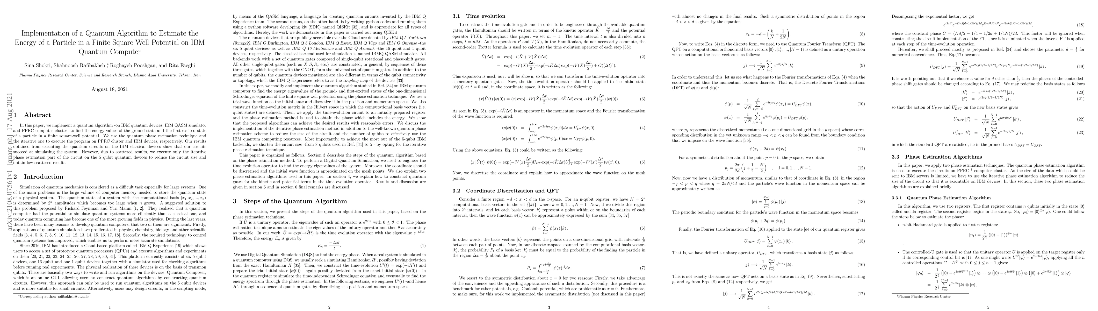 This research implements a quantum algorithm on IBM quantum devices and simulators to estimate the energy levels of a particle in a finite square well potential. Results from classical execution indicate successful simulations, while reduced circuit size on quantum devices yields more consistent outcomes using the iterative phase estimation technique.