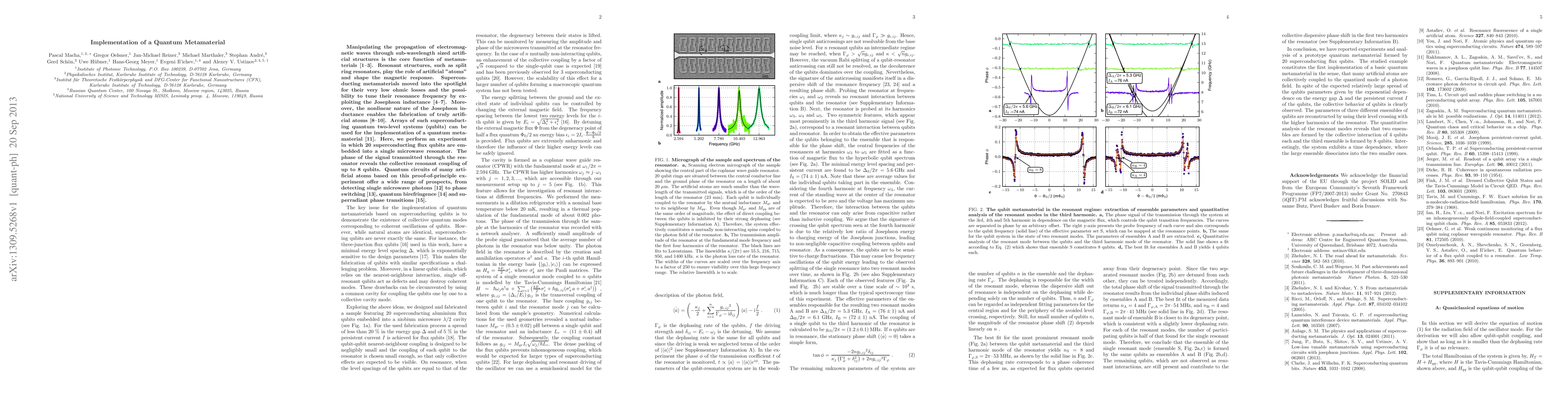 Manipulating the propagation of electromagnetic waves through sub-wavelength sized artificial structures is the core function of metamaterials. Resonant structures, such as split ring resonators, play the role of artificial "atoms" and shape the magnetic response. Superconducting metamaterials moved into the spotlight for their very low ohmic losses and the possibility to tune their resonance frequency by exploiting the Josephson inductance. Moreover, the nonlinear nature of the Josephson inductance enables the fabrication of truly artificial atoms. Arrays of such superconducting quantum two-level systems (qubits) can be used for the implementation of a quantum metamaterial. Here, we perform an experiment in which 20 superconducting flux qubits are embedded into a single microwave resonator. The phase of the signal transmitted through the resonator reveals the collective resonant coupling of up to 8 qubits. Quantum circuits of many artificial atoms based on this proof-of-principle experiment offer a wide range of prospects, from detecting single microwave photons to phase switching, quantum birefringence and superradiant phase transitions.