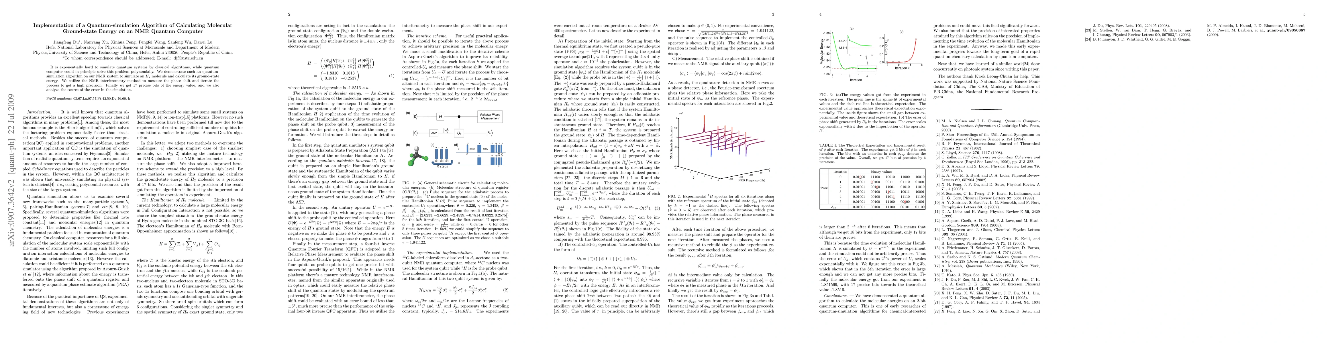 A quantum simulation algorithm was successfully implemented on an NMR quantum computer to calculate the ground-state energy of a hydrogen molecule with high precision, demonstrating the potential for polynomial-scale simulations over exponentially hard classical algorithms.