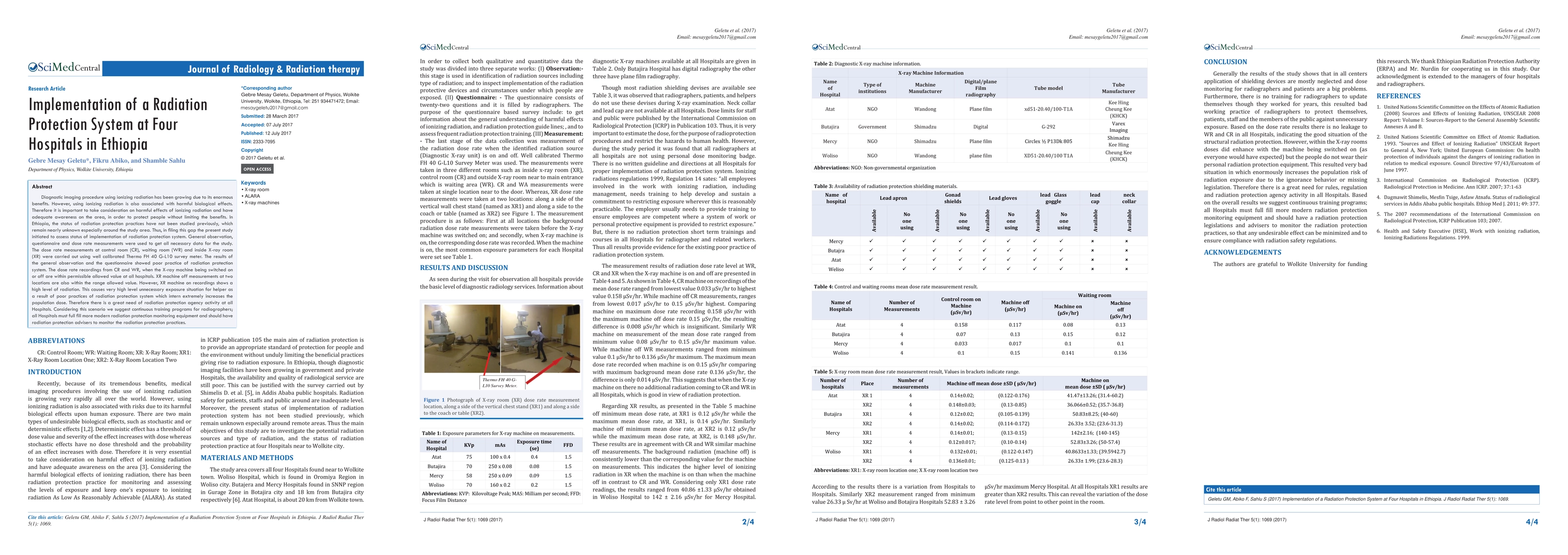 Diagnostic imaging procedure using ionizing radiation has been growing due to its enormous benefits. However, using ionizing radiation is also associated with harmful biological effects. Therefore it is important to take consideration on harmful effects of ionizing radiation and have adequate awareness on the area, in order to protect people without limiting the benefits. In Ethiopia, the status of radiation protection practices have not been studied previously, which remain nearly unknown especially around the study area. Thus, in filing this gap the present study initiated to assess status of implementation of radiation protection system. General observation, questionnaire and dose rate measurements were used to get all necessary data for the study. The dose rate measurements at control room (CR), waiting room (WR) and inside X-ray room (XR) were carried out using well calibrated Thermo FH 40 G-L10 survey meter. The results of the general observation and the questionnaire showed poor practice of radiation protection system. The dose rate recordings from CR and WR, when the X-ray machine being switched on or off are within permissible allowed value at all hospitals. XR machine off measurements at two locations are also within the range allowed value. However, XR machine on recordings shows a high level of radiation. This causes very high level unnecessary exposure situation for helper as a result of poor practices of radiation protection system which intern extremely increases the population dose. Therefore there is a great need of radiation protection agency activity at all Hospitals. Considering this scenario we suggest continuous training programs for radiographers; all Hospitals must full fill more modern radiation protection monitoring equipment and should have radiation protection advisers to monitor the radiation protection practices.