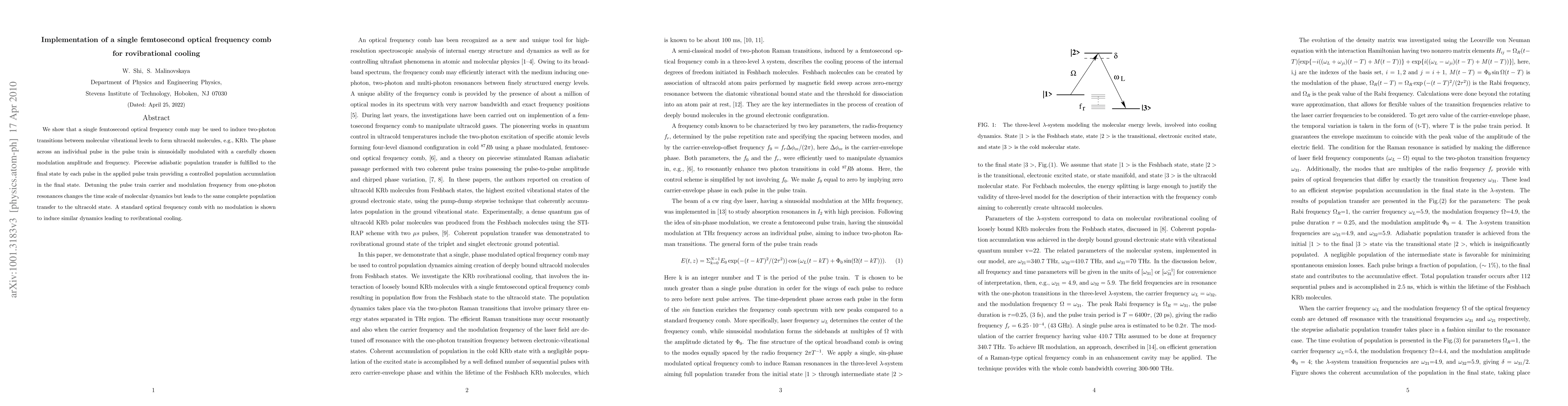 This paper demonstrates the use of a single femtosecond optical frequency comb to induce two-photon transitions for rovibrational cooling of ultracold molecules like KRb. The modulation of the phase across pulses enables precise population transfer to the final state, achieving rovibrational cooling even when detuning from one-photon resonances.