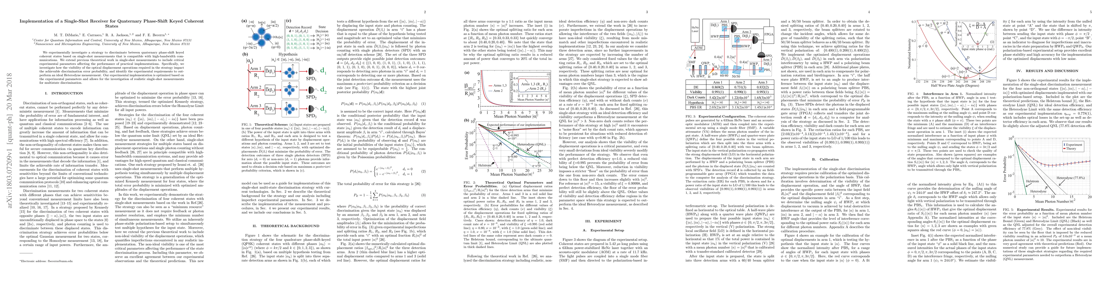 We experimentally investigate a strategy to discriminate between quaternary phase-shift keyed coherent states based on single-shot measurements that is compatible with high-bandwidth communications. We extend previous theoretical work in single-shot measurements to include critical experimental parameters affecting the performance of practical implementations. Specifically, we investigate how the visibility of the optical displacement operations required in the strategy impacts the achievable discrimination error probability, and identify the experimental requirements to outperform an ideal heterodyne measurement. Our experimental implementation is optimized based on the experimental parameters and allows for the investigation of realistic single-shot measurements for multistate discrimination.