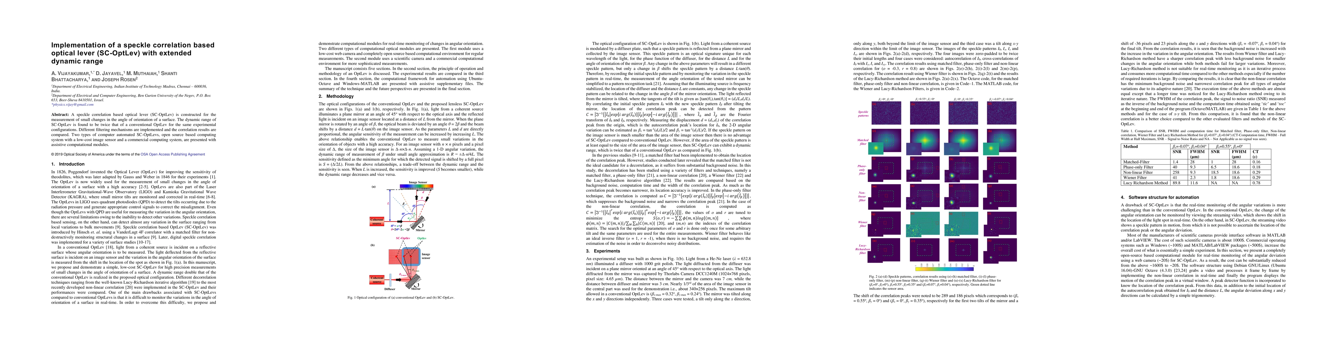 A speckle correlation based optical lever (SC-OptLev) is constructed for the measurement of small changes in the angle of orientation of a surface. The dynamic range of SC-OptLev is found to be twice that of a conventional OptLev for the same experimental configurations. Different filtering mechanisms are implemented and the correlation results are compared. Two types of computer automated SC-OptLevs, open source based computing system with a low-cost image sensor and a commercial computing system, are presented with assistive computational modules.