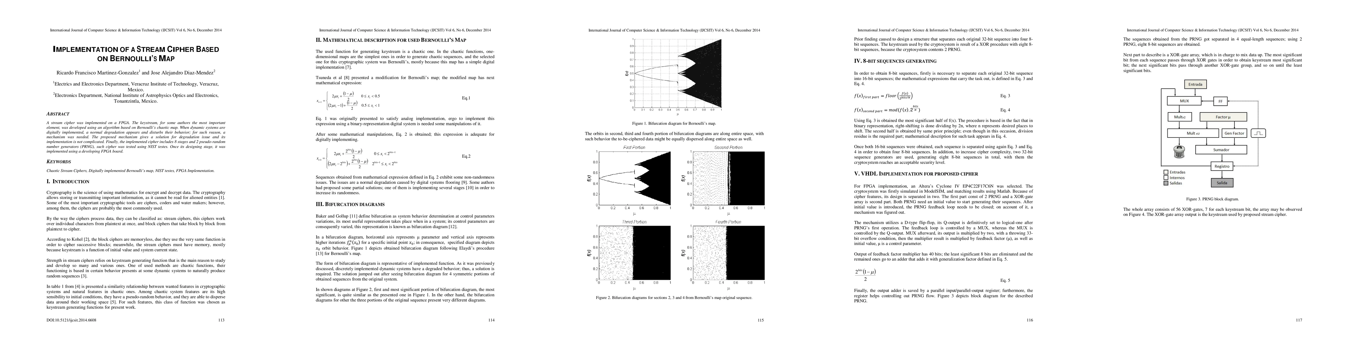 A stream cipher was implemented on a FPGA. The keystream, for some authors the most important element, was developed using an algorithm based on Bernoullis chaotic map. When dynamic systems are digitally implemented, a normal degradation appears and disturbs their behavior; for such reason, a mechanism was needed. The proposed mechanism gives a solution for degradation issue and its implementation is not complicated. Finally, the implemented cipher includes 8 stages and 2 pseudo-random number generators (PRNG), such cipher was tested using NIST testes. Once its designing stage, it was implemented using a developing FPGA board.