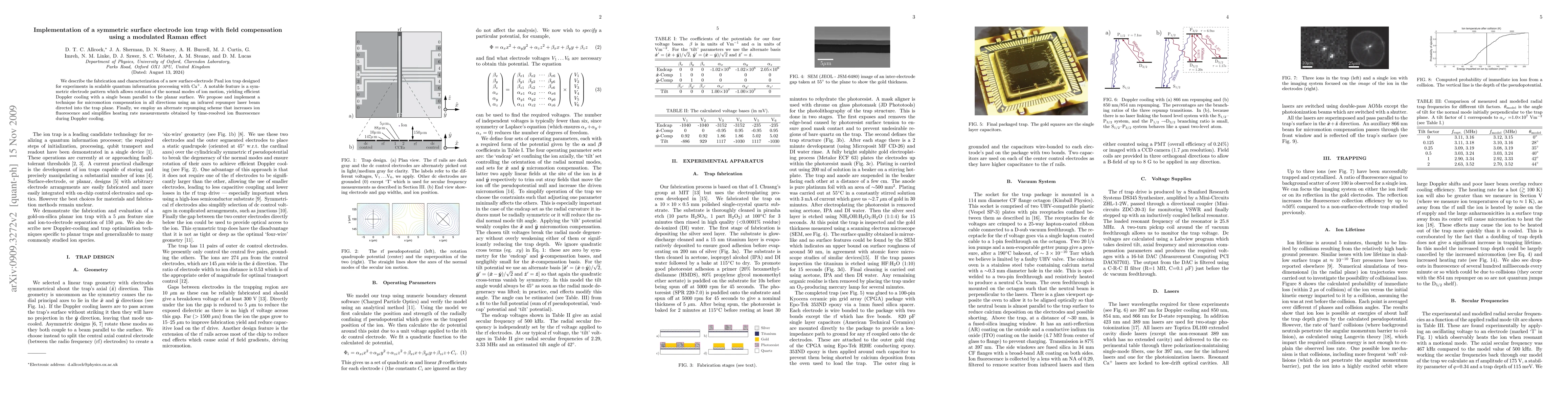 The paper presents a symmetric surface electrode ion trap with field compensation for scalable quantum information processing using Ca+ ions, featuring rotation of normal modes for efficient Doppler cooling. It employs a technique for micromotion compensation using an infrared repumper laser, and an alternate repumping scheme to enhance ion fluorescence and simplify heating rate measurements.