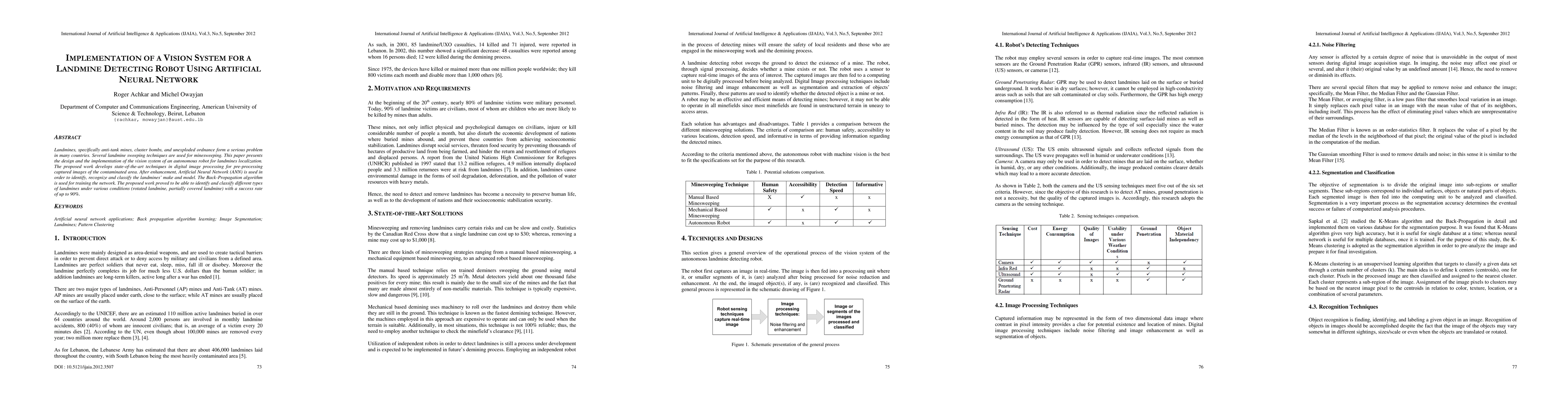 Landmines, specifically anti-tank mines, cluster bombs, and unexploded ordnance form a serious problem in many countries. Several landmine sweeping techniques are used for minesweeping. This paper presents the design and the implementation of the vision system of an autonomous robot for landmines localization. The proposed work develops state-of-the-art techniques in digital image processing for pre-processing captured images of the contaminated area. After enhancement, Artificial Neural Network (ANN) is used in order to identify, recognize and classify the landmines' make and model. The Back-Propagation algorithm is used for training the network. The proposed work proved to be able to identify and classify different types of landmines under various conditions (rotated landmine, partially covered landmine) with a success rate of up to 90%.