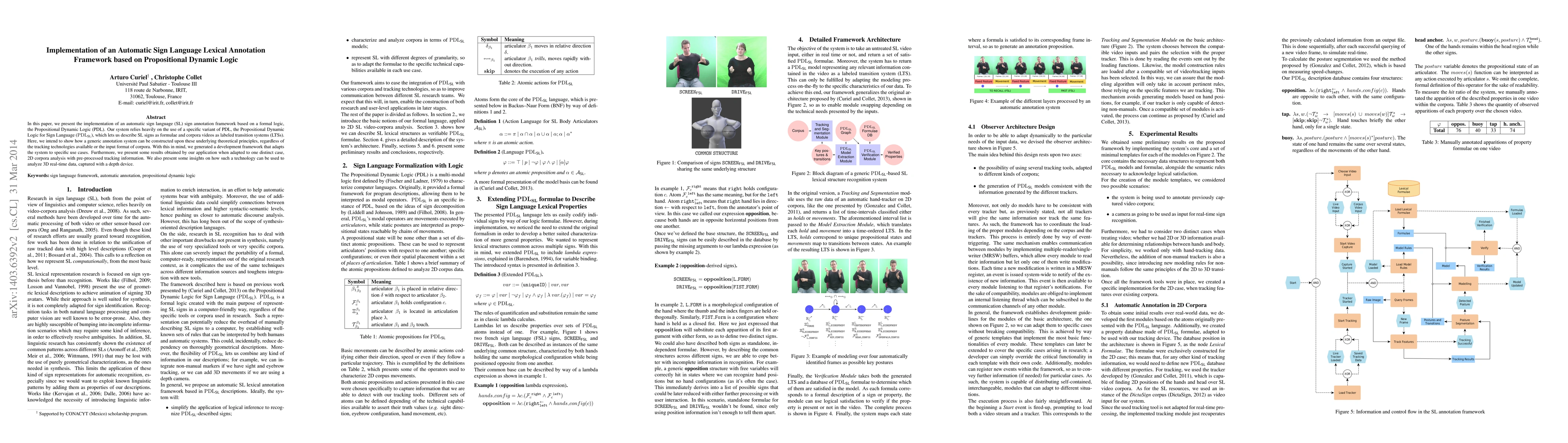 In this paper, we present the implementation of an automatic Sign Language (SL) sign annotation framework based on a formal logic, the Propositional Dynamic Logic (PDL). Our system relies heavily on the use of a specific variant of PDL, the Propositional Dynamic Logic for Sign Language (PDLSL), which lets us describe SL signs as formulae and corpora videos as labeled transition systems (LTSs). Here, we intend to show how a generic annotation system can be constructed upon these underlying theoretical principles, regardless of the tracking technologies available or the input format of corpora. With this in mind, we generated a development framework that adapts the system to specific use cases. Furthermore, we present some results obtained by our application when adapted to one distinct case, 2D corpora analysis with pre-processed tracking information. We also present some insights on how such a technology can be used to analyze 3D real-time data, captured with a depth device.