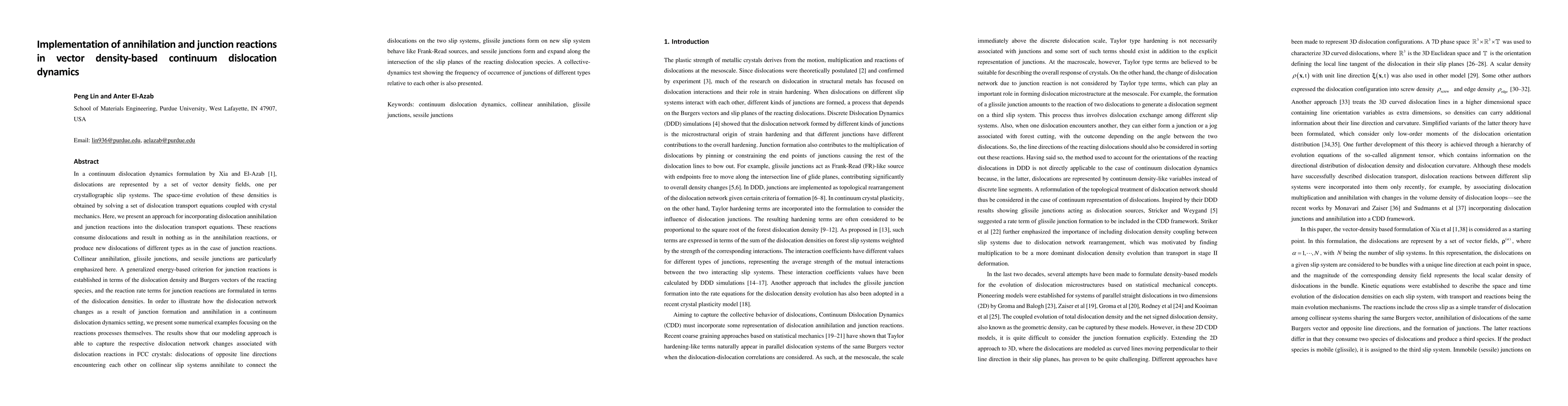 This paper introduces a method to incorporate dislocation annihilation and junction reactions into vector density-based continuum dislocation dynamics, focusing on collinear annihilation and glissile/sessile junctions. Numerical examples demonstrate the model's ability to capture dislocation network changes in FCC crystals, including junction formation and annihilation processes.