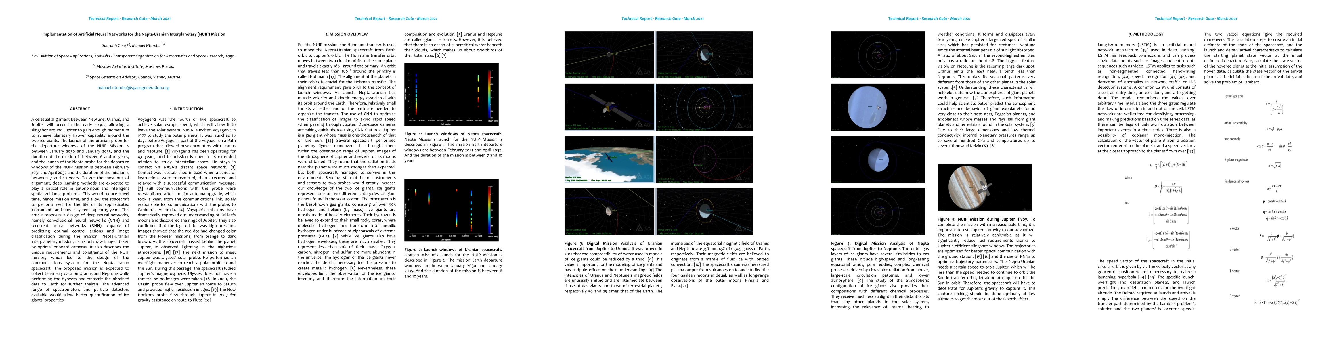 A celestial alignment between Neptune, Uranus, and Jupiter will occur in the early 2030s, allowing a slingshot around Jupiter to gain enough momentum to achieve planetary flyover capability around the two ice giants. The launch of the uranian probe for the departure windows of the NUIP mission is between January 2030 and January 2035, and the duration of the mission is between six and ten years, and the launch of the Nepta probe for the departure windows of the NUIP mission is between February 2031 and April 2032 and the duration of the mission is between seven and ten years. To get the most out of alignment, deep learning methods are expected to play a critical role in autonomous and intelligent spatial guidance problems. This would reduce travel time, hence mission time, and allow the spacecraft to perform well for the life of its sophisticated instruments and power systems up to fifteen years. This article proposes a design of deep neural networks, namely convolutional neural networks and recurrent neural networks, capable of predicting optimal control actions and image classification during the mission. Nepta-Uranian interplanetary mission, using only raw images taken by optimal onboard cameras. It also describes the unique requirements and constraints of the NUIP mission, which led to the design of the communications system for the Nepta-Uranian spacecraft. The proposed mission is expected to collect telemetry data on Uranus and Neptune while performing the flyovers and transmit the obtained data to Earth for further analysis. The advanced range of spectrometers and particle detectors available would allow better quantification of the ice giant's properties.