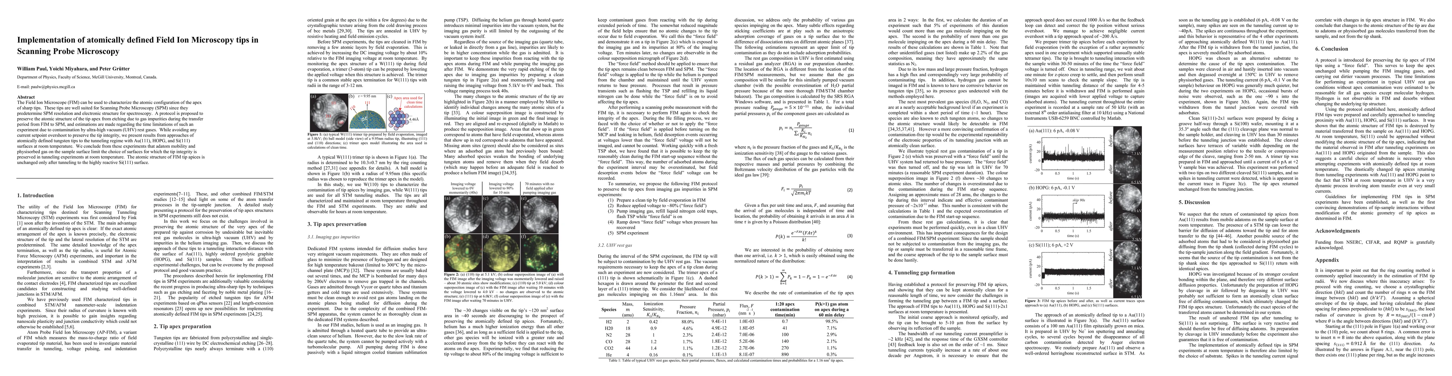 This paper proposes a method to transfer atomically defined Field Ion Microscopy tips to Scanning Probe Microscopy without degrading the tip's atomic structure, concluding that tip integrity is best preserved when tunneling to the highly reactive Si(111) surface due to limited adatom mobility and surface contamination.