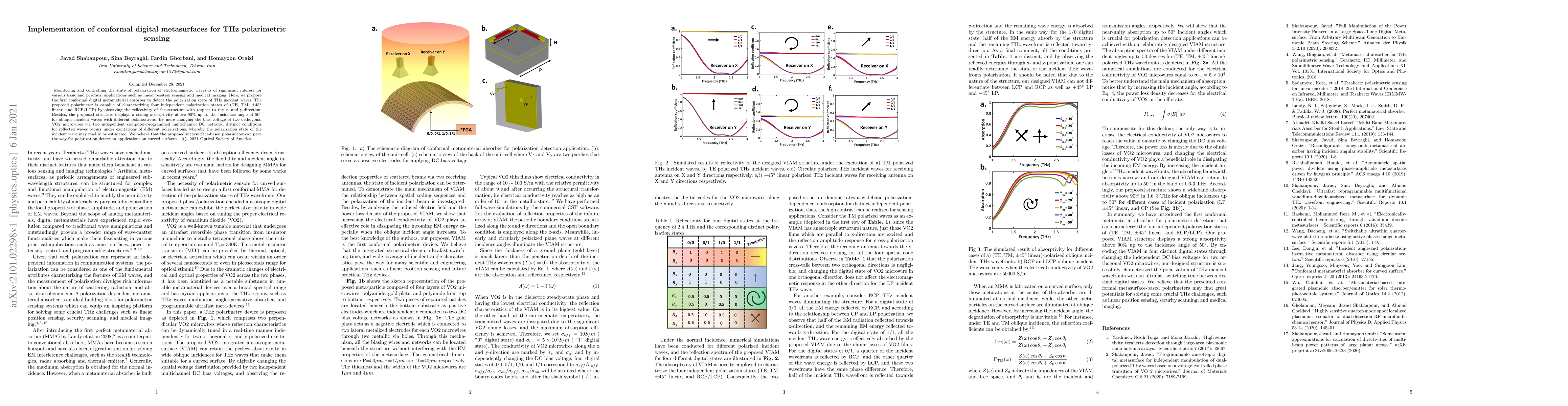 This paper proposes a conformal digital metasurface for THz polarimetric sensing, capable of detecting four independent polarization states with high reflectivity and strong absorptivity. The metasurface uses bias voltages on VO2 microwires to change reflected wave conditions, enabling polarization state estimation.