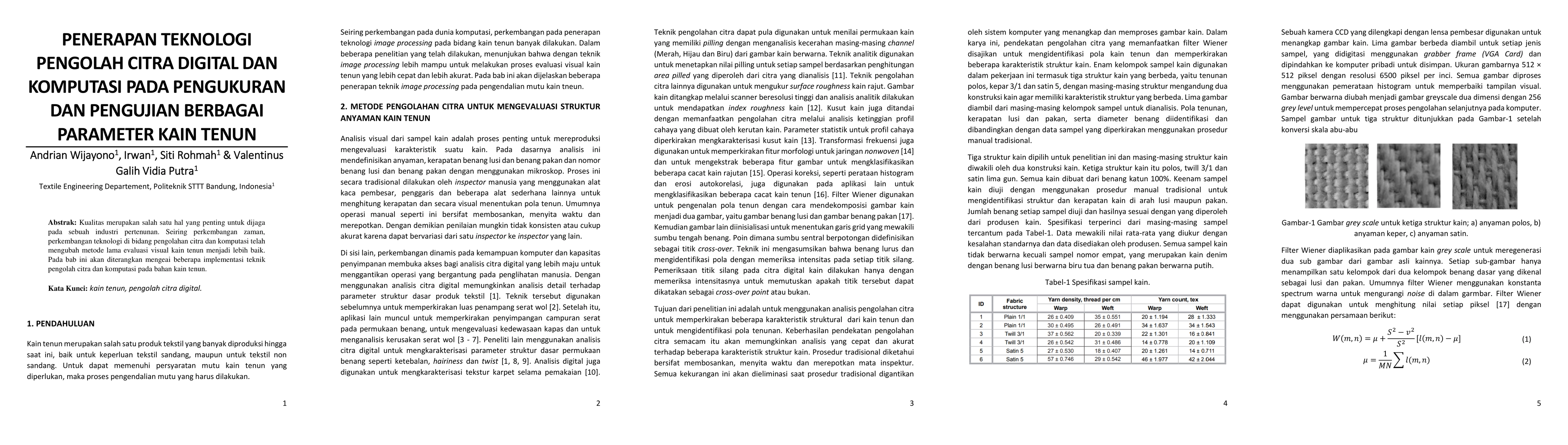 Quality is one of the important things to be maintained in a weaving industry. Along with the times, technological developments in the field of image processing and computing have changed the old method of visual evaluation of woven fabric to be better. This chapter will explain the implementation of image and computational processing techniques on woven fabric. Keywords: woven fabric, digital image processing.