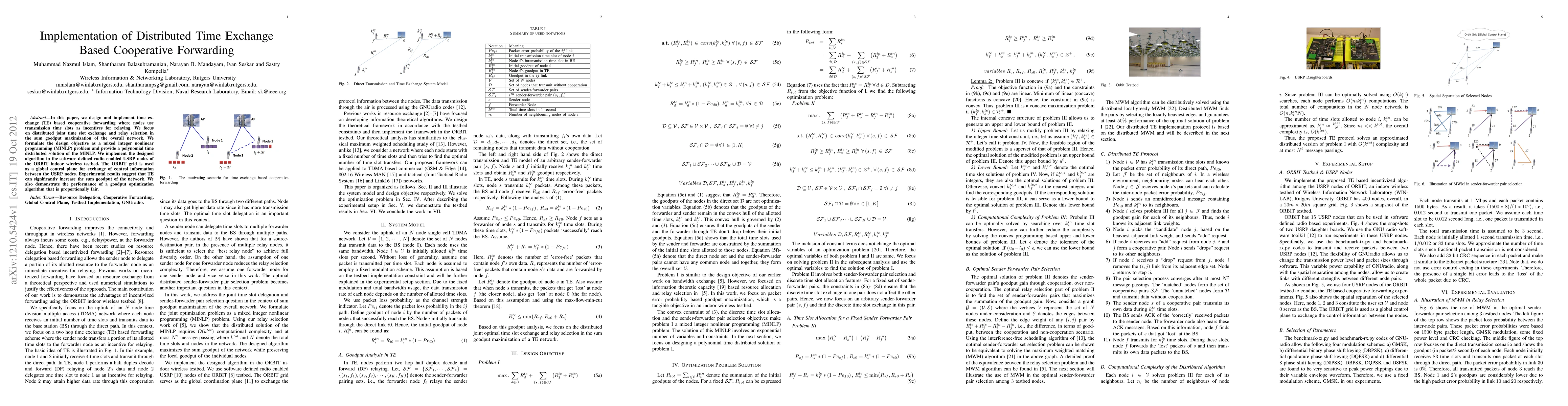 In this paper, we design and implement time exchange (TE) based cooperative forwarding where nodes use transmission time slots as incentives for relaying. We focus on distributed joint time slot exchange and relay selection in the sum goodput maximization of the overall network. We formulate the design objective as a mixed integer nonlinear programming (MINLP) problem and provide a polynomial time distributed solution of the MINLP. We implement the designed algorithm in the software defined radio enabled USRP nodes of the ORBIT indoor wireless testbed. The ORBIT grid is used as a global control plane for exchange of control information between the USRP nodes. Experimental results suggest that TE can significantly increase the sum goodput of the network. We also demonstrate the performance of a goodput optimization algorithm that is proportionally fair.