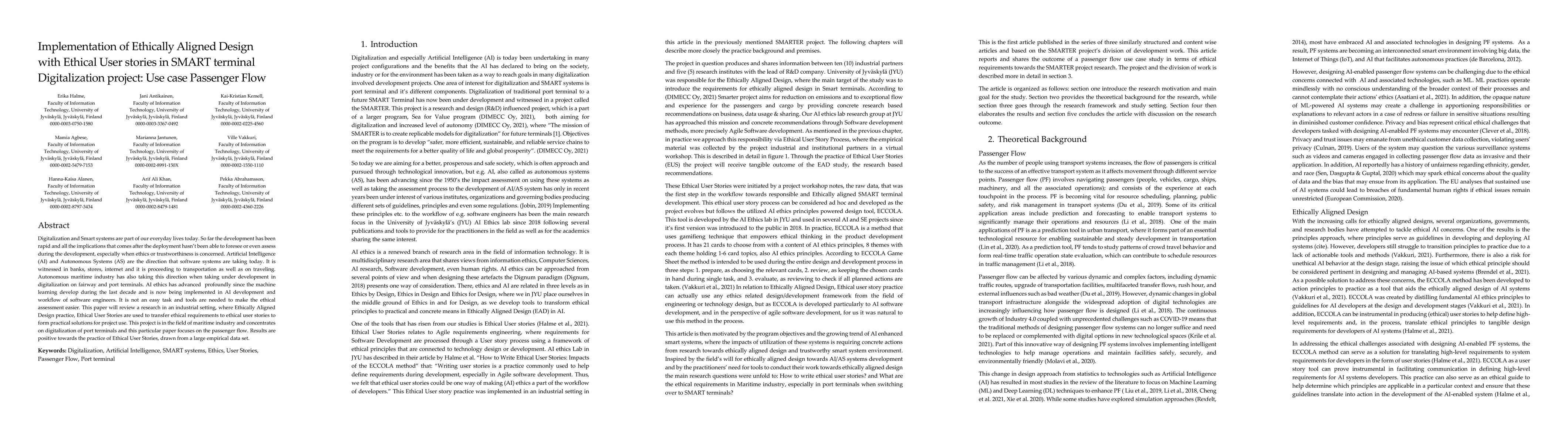 Digitalization and Smart systems are part of our everyday lives today. So far the development has been rapid and all the implications that comes after the deployment has not been able to foresee or even assess during the development, especially when ethics or trustworthiness is concerned. Artificial Intelligence (AI) and Autonomous Systems (AS) are the direction that software systems are taking today. It is witnessed in banks, stores, internet and it is proceeding to transportation as well as on traveling. Autonomous maritime industry has also taking this direction when taking under development in digitalization on fairway and port terminals. AI ethics has advanced profoundly since the machine learning develop during the last decade and is now being implemented in AI development and workflow of software engineers. It is not an easy task and tools are needed to make the ethical assessment easier. This paper will review a research in an industrial setting, where Ethically Aligned Design practice, Ethical User Stories are used to transfer ethical requirements to ethical user stories to form practical solutions for project use. This project is in the field of maritime industry and concentrates on digitalization of port terminals and this particular paper focuses on the passenger flow. Results are positive towards the practice of Ethical User Stories, drawn from a large empirical data set.