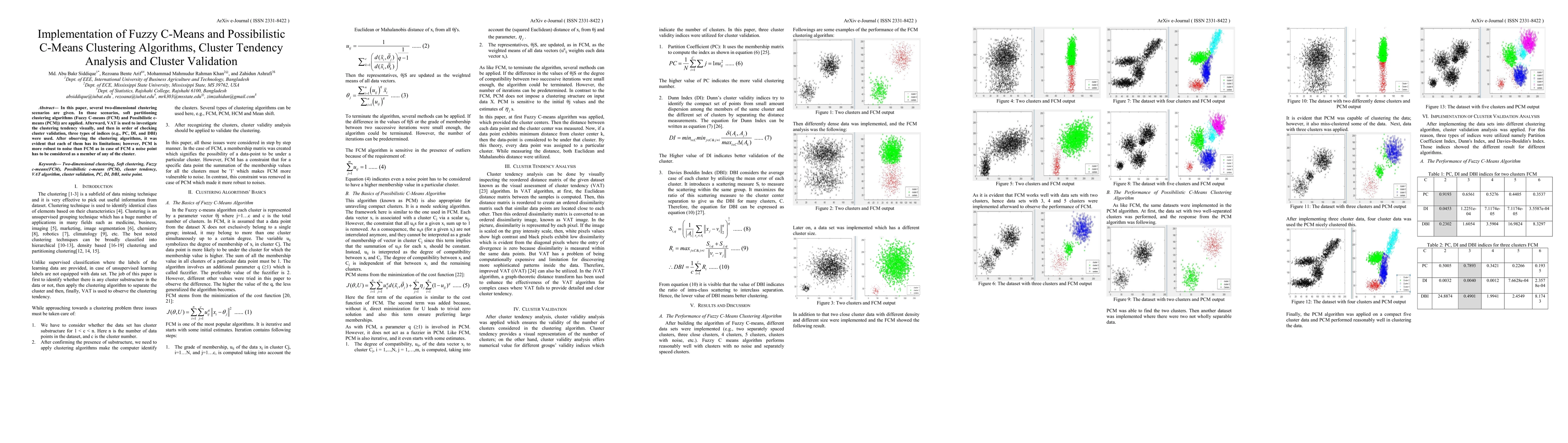 This paper applies Fuzzy C-means (FCM) and Possibilistic C-means (PCM) clustering algorithms to two-dimensional datasets, followed by visual and index-based validation. PCM is found to be more robust to noise compared to FCM, which struggles with noise points.