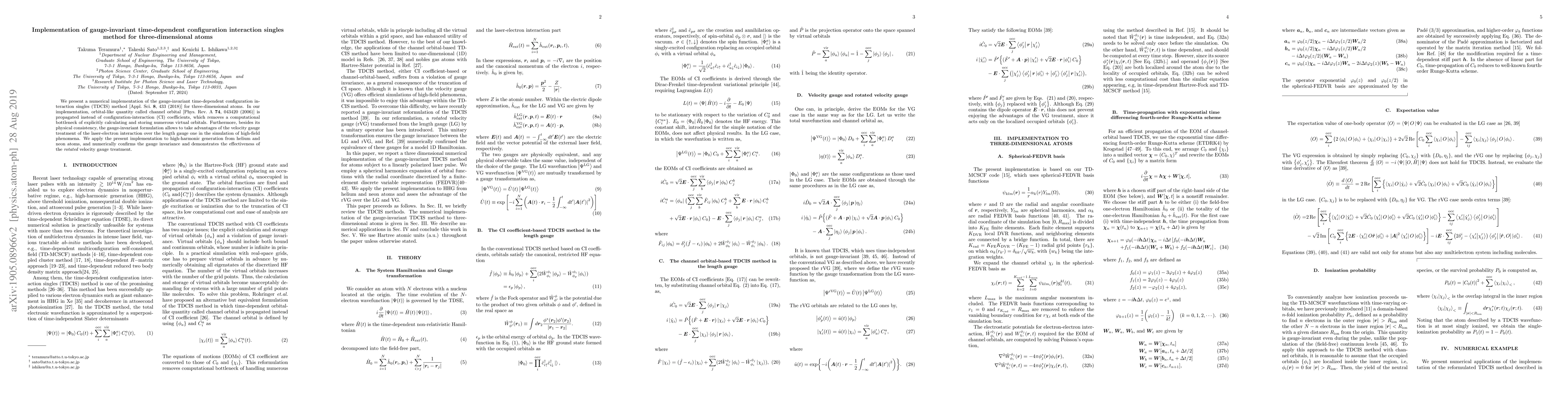 We present a numerical implementation of the gauge-invariant time-dependent configuration interaction singles (TDCIS) method [Appl. Sci. 8, 433 (2018)] for three-dimensional atoms. In our implementation, orbital-like quantity called channel orbital [Phys. Rev. A 74, 043420 (2006)] is propagated instead of configuration-interaction (CI) coefficients, which removes a computational bottleneck of explicitly calculating and storing numerous virtual orbitals. Furthermore, besides its physical consistency, the gauge-invariant formulation allows to take advantages of the velocity gauge treatment of the laser-electron interaction over the length gauge one in the simulation of high-field phenomena. We apply the present implementation to high-harmonic generation from helium and neon atoms, and numerically confirms the gauge invariance and demonstrates the effectiveness of the rotated velocity gauge treatment.