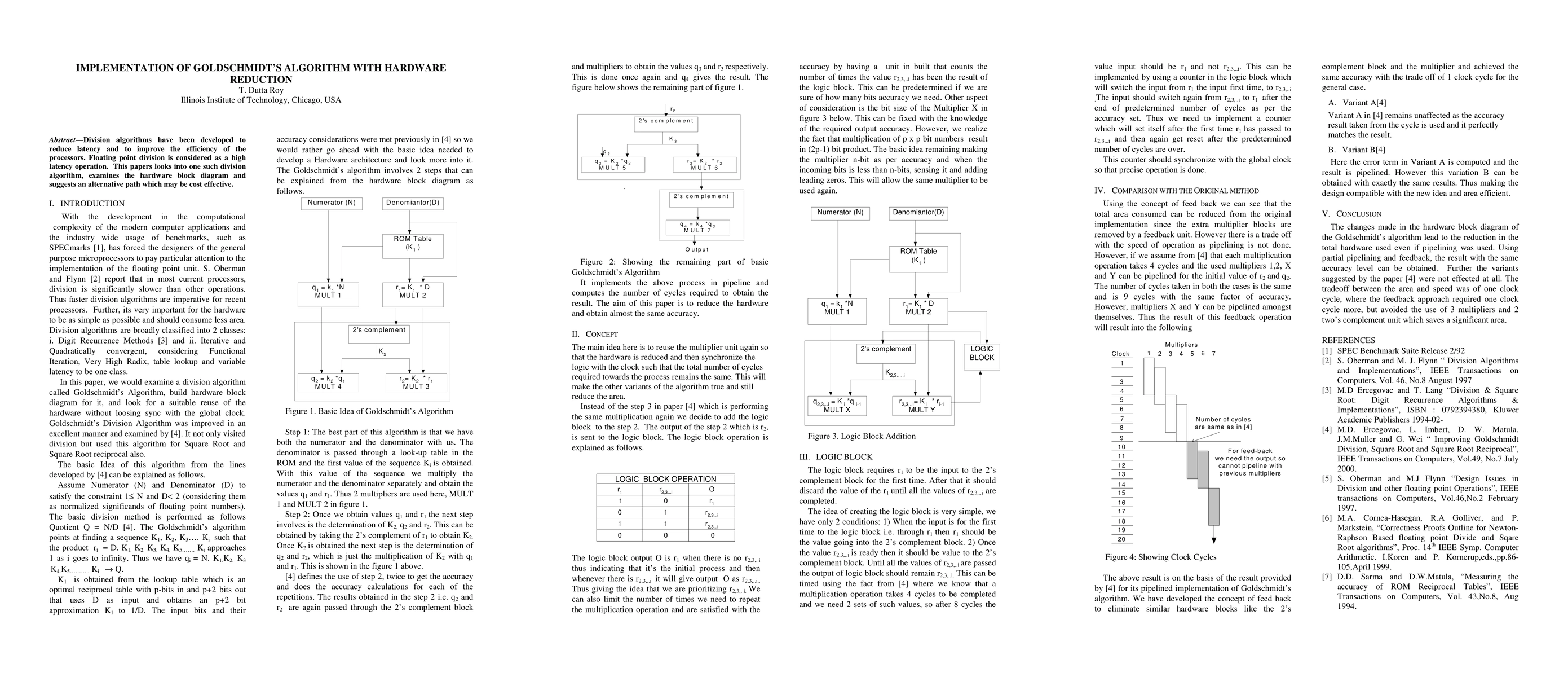 The paper presents a hardware-efficient implementation of Goldschmidt's Algorithm with a feedback mechanism for hardware reuse, reducing the overall area without significantly impacting performance.