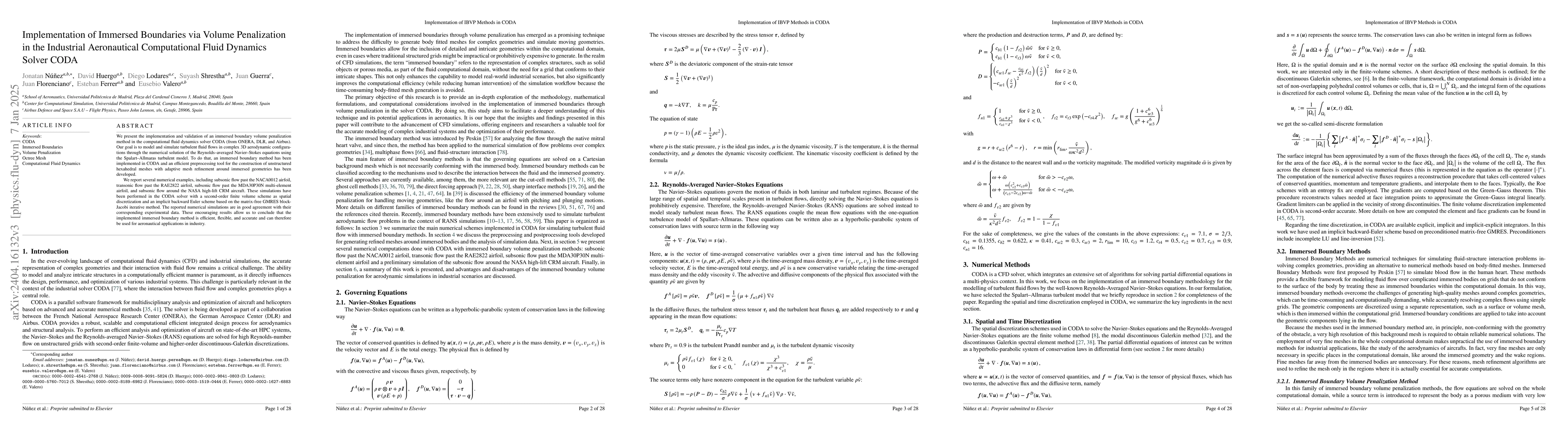This paper details the implementation of immersed boundary volume penalization in the CODA solver for simulating turbulent fluid flows in complex aerodynamic configurations. The method is validated through accurate simulations of subsonic flows around various airfoils and an aircraft, showing good agreement with experimental data.