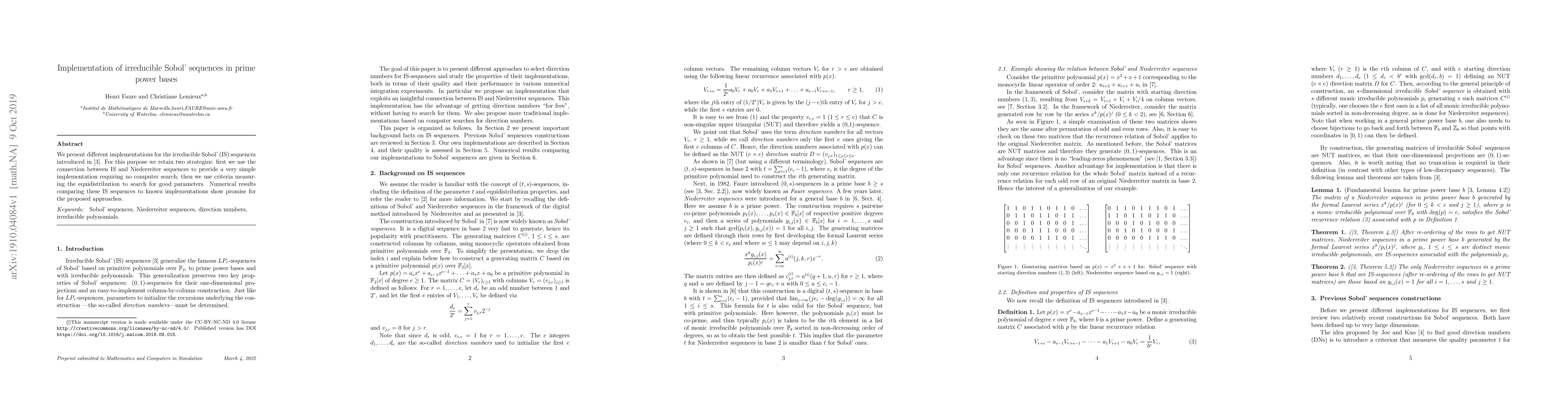 We present different implementations for the irreducible Sobol (IS) sequences introduced in [3]. For this purpose we retain two strategies: first we use the connection between IS and Niederreiter sequences to provide a very simple implementation requiring no computer search; then we use criteria measuring the equidistribution to search for good parameters. Numerical results comparing these IS sequences to known implementations show promise for the proposed approaches.