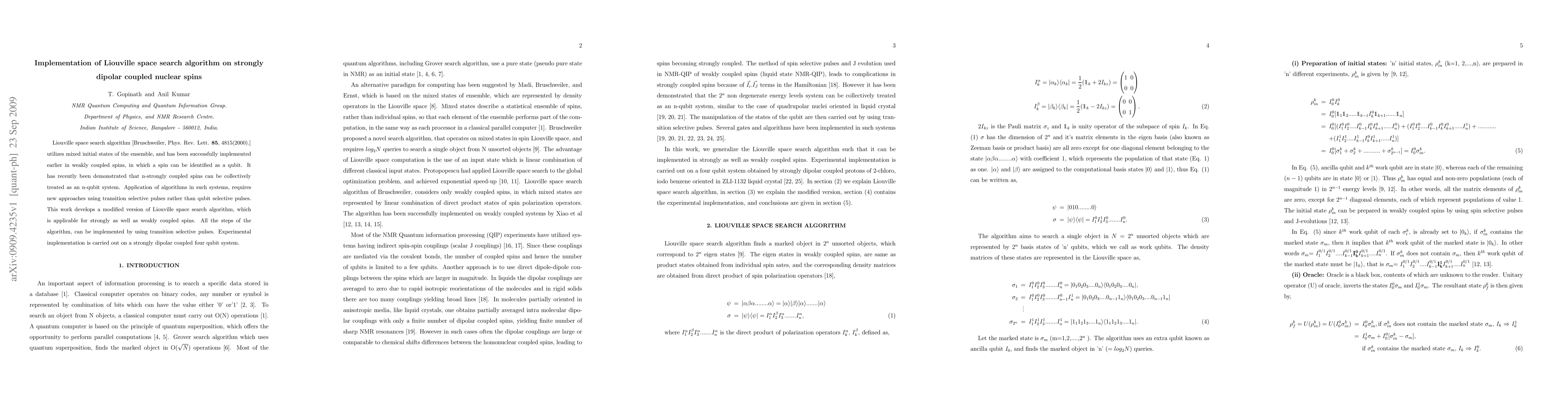 Researchers developed a modified version of the Liouville space search algorithm to work with strongly dipolar coupled nuclear spins, enabling efficient experimental implementation on a four-qubit system. The new approach uses transition selective pulses, expanding its applicability to systems where qubit-selective pulses are not feasible.