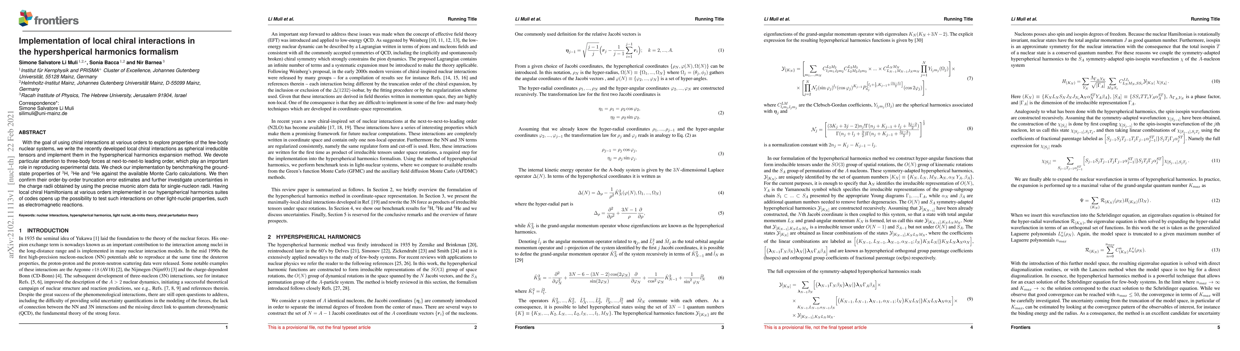 With the goal of using chiral interactions at various orders to explore properties of the few-body nuclear systems, we write the recently developed local chiral interactions as spherical irreducible tensors and implement them in the hyperspherical harmonics expansion method. We devote particular attention to three-body forces at next-to-next-to leading order, which play an important role in reproducing experimental data. We check our implementation by benchmarking the ground-state properties of $^3$H, $^3$He and $^4$He against the available Monte Carlo calculations. We then confirm their order-by-order truncation error estimates and further investigate uncertainties in the charge radii obtained by using the precise muonic atom data for single-nucleon radii. Having local chiral Hamiltonians at various orders implemented in our hyperspherical harmonics suites of codes opens up the possibility to test such interactions on other light-nuclei properties, such as electromagnetic reactions.