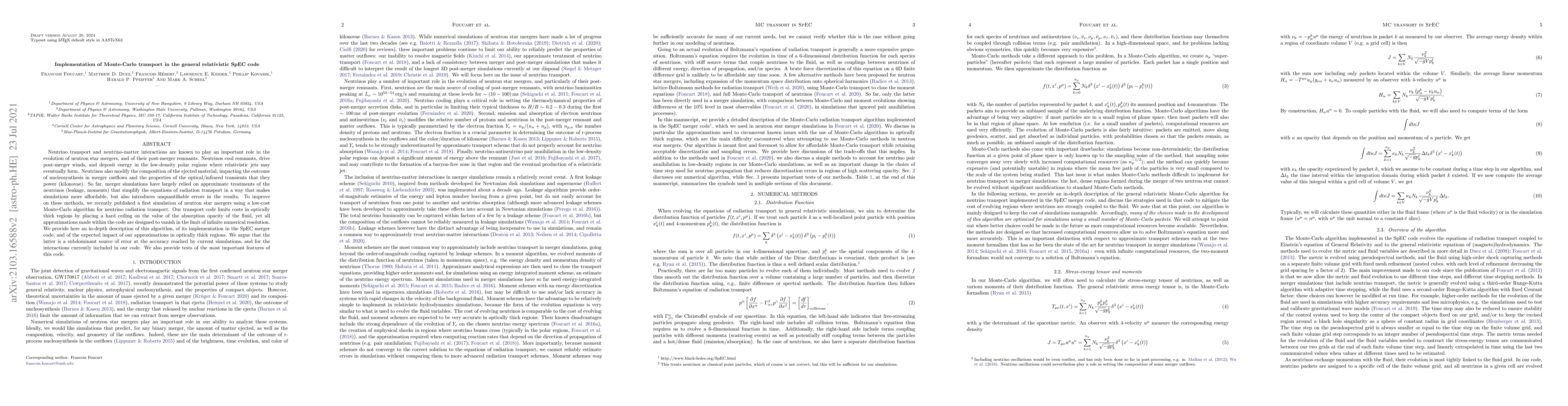 This paper details the implementation of a Monte-Carlo transport algorithm for neutrino radiation in the SpEC code, aiming to improve the accuracy of neutron star merger simulations. The new method reduces errors compared to previous approximations and is expected to enhance the understanding of post-merger processes and nucleosynthesis outcomes.