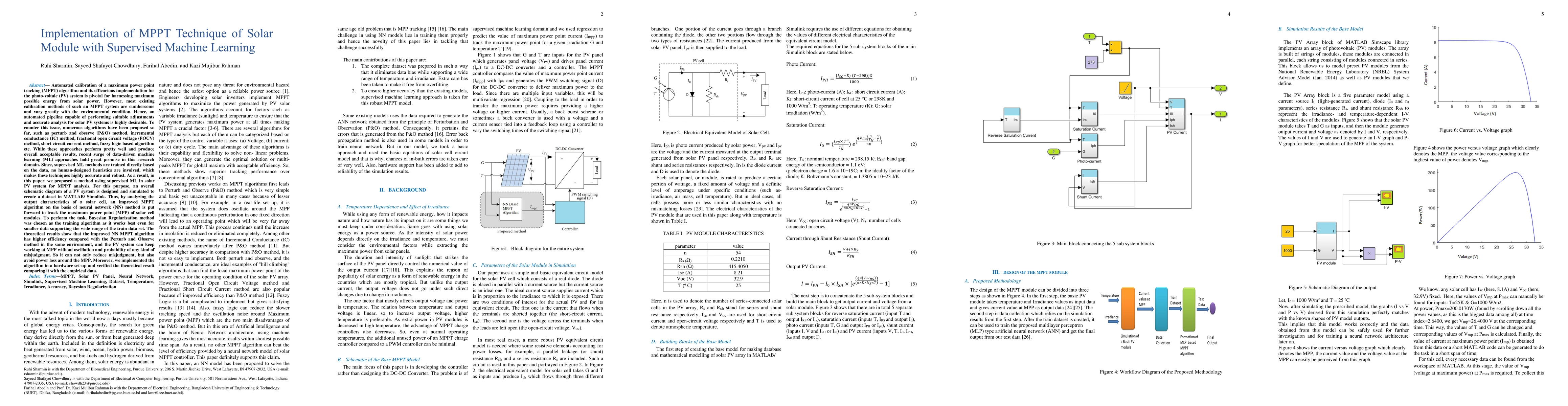 In this paper, we proposed a method using supervised ML in solar PV system for MPPT analysis. For this purpose, an overall schematic diagram of a PV system is designed and simulated to create a dataset in MATLAB/ Simulink. Thus, by analyzing the output characteristics of a solar cell, an improved MPPT algorithm on the basis of neural network (NN) method is put forward to track the maximum power point (MPP) of solar cell modules. To perform the task, Bayesian Regularization method was chosen as the training algorithm as it works best even for smaller data supporting the wide range of the train data set. The theoretical results show that the improved NN MPPT algorithm has higher efficiency compared with the Perturb and Observe method in the same environment, and the PV system can keep working at MPP without oscillation and probability of any kind of misjudgment. So it can not only reduce misjudgment, but also avoid power loss around the MPP. Moreover, we implemented the algorithm in a hardware set-up and verified the theoretical result comparing it with the empirical data.