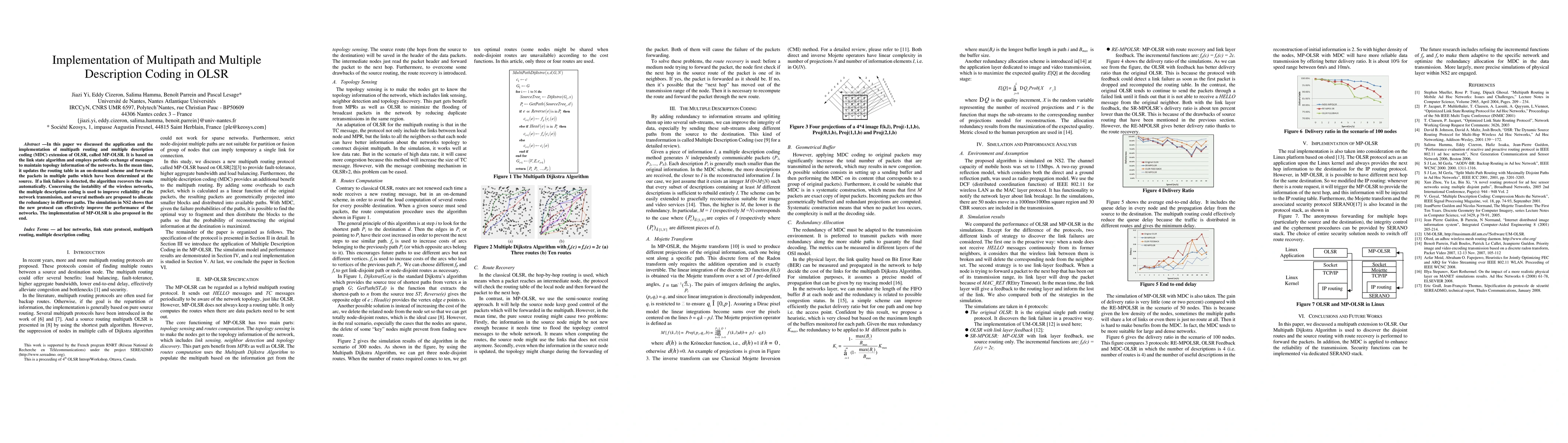 This paper introduces MP-OLSR, a protocol combining multipath routing and Multiple Description Coding (MDC) with OLSR for improved wireless network performance. Simulation in NS2 shows enhanced network stability and reliability, with proposed route recovery and redundancy allocation methods.