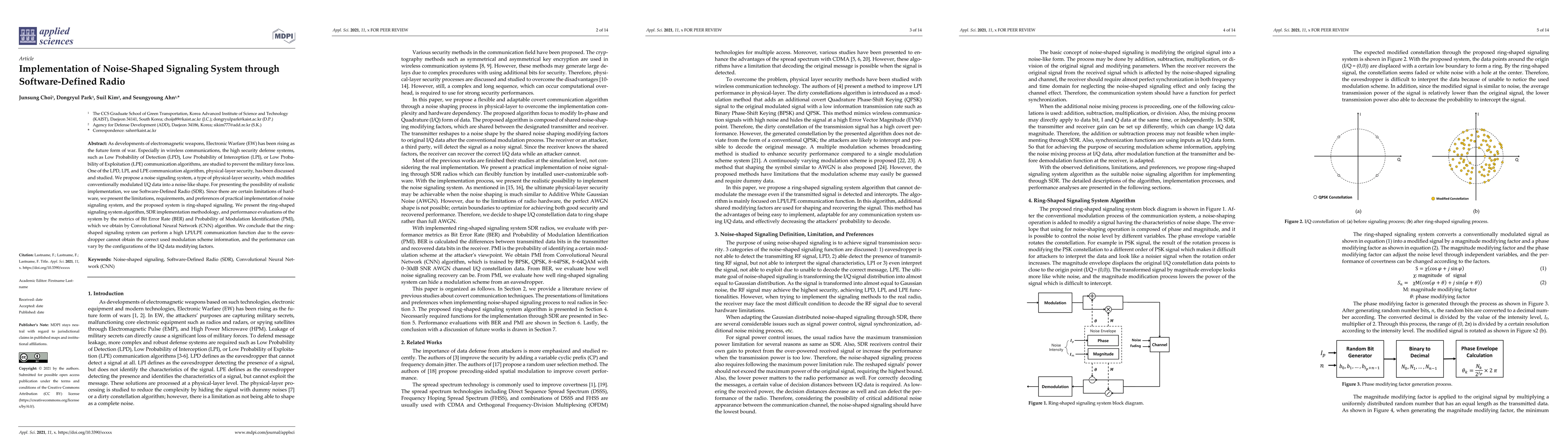 As developments of electromagnetic weapons, Electronic Warfare (EW) has been rising as the future form of war. Especially in wireless communications, the high security defense systems, such as Low Probability of Detection (LPD), Low Probability of Interception (LPI), or Low Prob-ability of Exploitation (LPE) communication algorithms, are studied to prevent the military force loss. One of the LPD, LPI, and LPE communication algorithm, physical-layer security, has been discussed and studied. We propose a noise signaling system, a type of physical-layer secu-rity, which modifies conventionally modulated I/Q data into a noise-like shape. For presenting the possibility of realistic implementation, we use Software-Defined Radio (SDR). Since there are certain limitations of hardware, we present the limitations, requirements, and preferences of practical implementation of noise signaling system, and the proposed system is ring-shaped signaling. We present the ring-shaped signaling system algorithm, SDR implementation meth-odology, and performance evaluations of the system by the metrics of Bit Error Rate (BER) and Probability of Modulation Identification (PMI), which we obtain by Convolutional Neural Net-work (CNN) algorithm. We conclude that the ring-shaped signaling system can perform a high LPI/LPE communication function due to the eavesdropper cannot obtain the correct used modu-lation scheme information, and the performance can vary by the configurations of the I/Q data modifying factors.