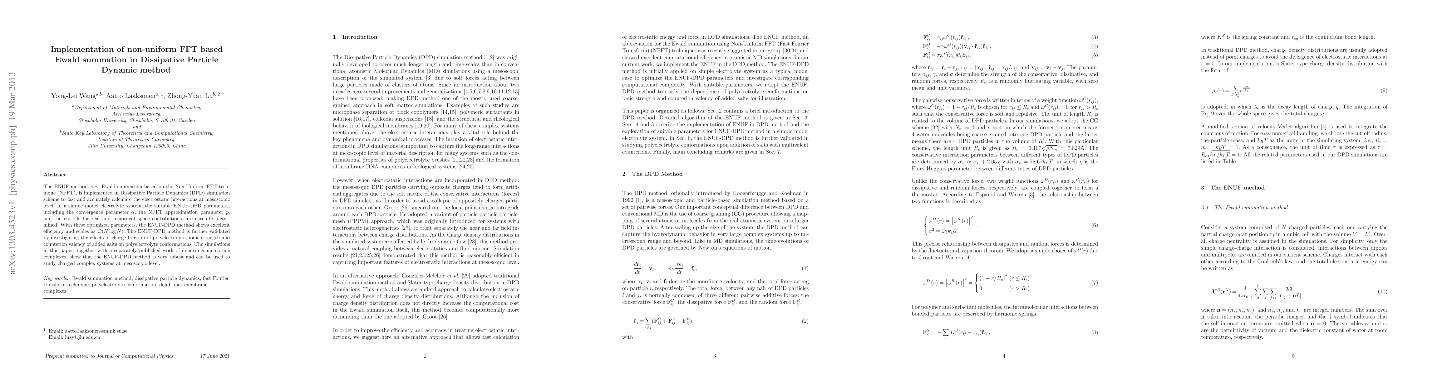 The research paper introduces the ENUF method, combining Ewald summation with Non-Uniform FFT (NFFT) for efficient calculation of electrostatic interactions in Dissipative Particle Dynamics (DPD) simulations. Optimized parameters for this ENUF-DPD method are determined, demonstrating its $mathcal{O}(Nlog N)$ efficiency. The method successfully validates simulations of various electrolyte system properties, showcasing its robustness for studying charged complex systems at a mesoscopic level.