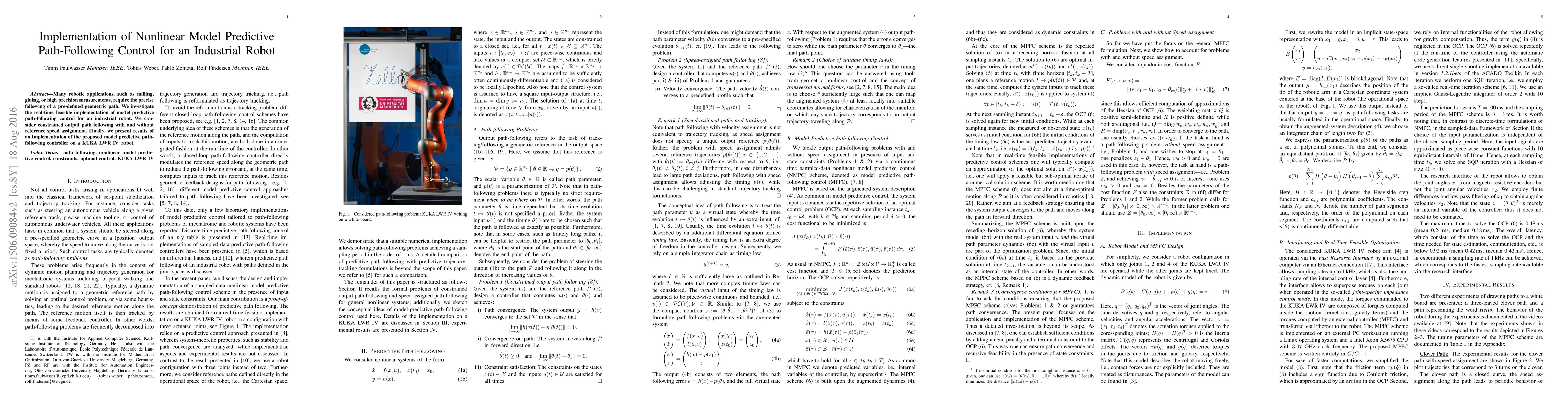 This paper explores real-time implementation of nonlinear model predictive path-following control for industrial robots, focusing on constrained output path following with and without reference speed assignment, and demonstrates results on a KUKA LWR IV robot.