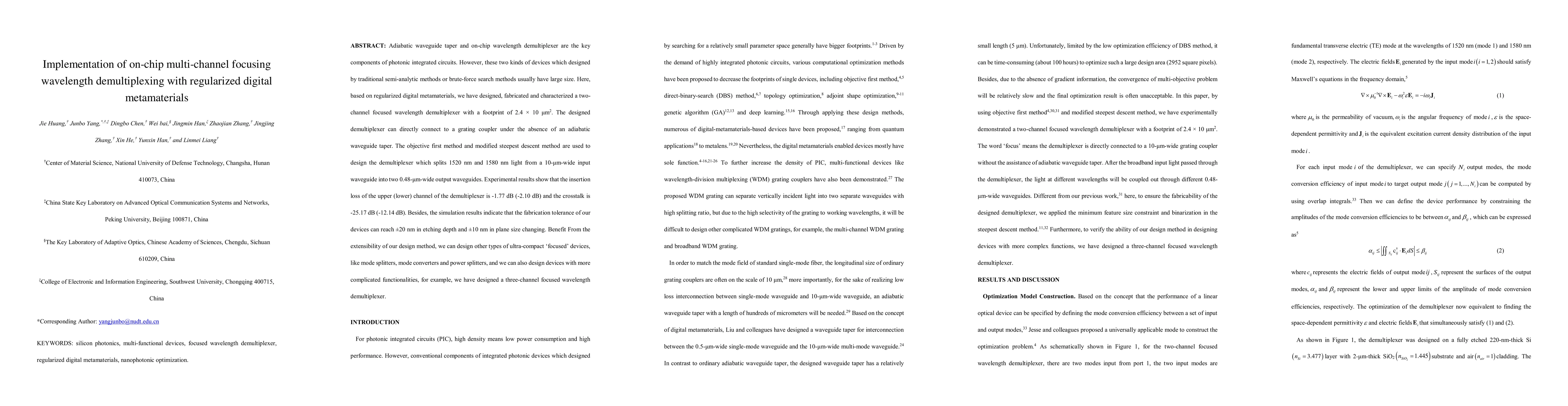 Adiabatic waveguide taper and on-chip wavelength demultiplexer are the key components of photonic integrated circuits. However, these two kinds of devices which designed by traditional semi-analytic methods or brute-force search methods usually have large size. Here, based on regularized digital metamaterials, we have designed, fabricated and characterized a two-channel focused wavelength demultiplexer with a footprint of 2.4 x 10 um2. The designed demultiplexer can directly connect to a grating coupler under the absence of an adiabatic waveguide taper. The objective first method and modified steepest descent method are used to design the demultiplexer which splits 1520 nm and 1580 nm light from a 10-um-wide input waveguide into two 0.48-um-wide output waveguides. Experimental results show that the insertion loss of the upper (lower) channel of the demultiplexer is -1.77 dB (-2.10 dB) and the crosstalk is -25.17 dB (-12.14 dB). Besides, the simulation results indicate that the fabrication tolerance of our devices can reach 20 nm in etching depth and 10 nm in plane size changing. Benefit From the extensibility of our design method, we can design other types of ultra-compact 'focused' devices, like mode splitters, mode converters and power splitters, and we can also design devices with more complicated functionalities, for example, we have designed a three-channel focused wavelength demultiplexer.