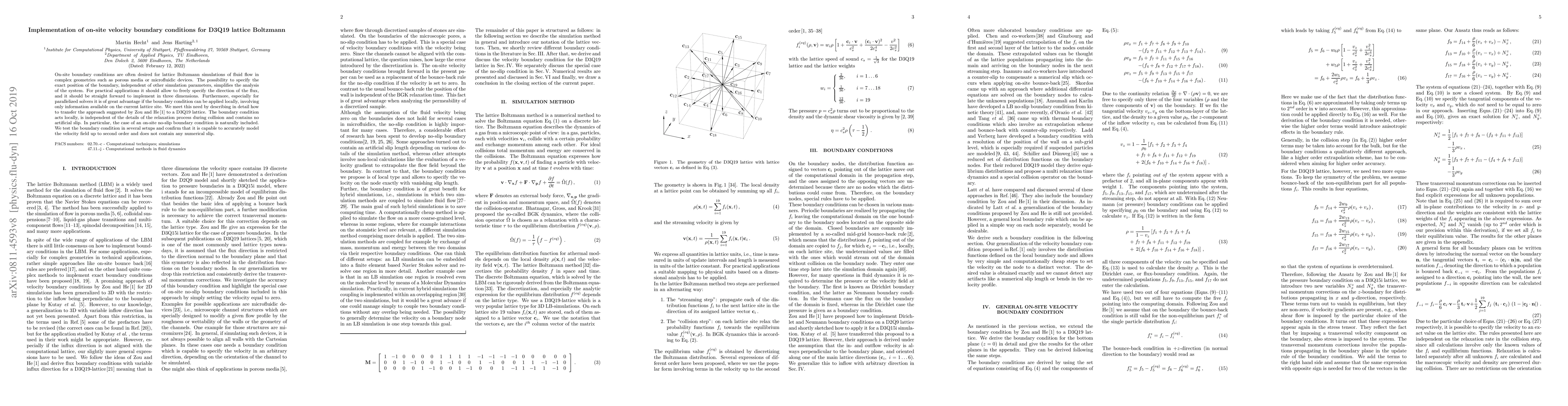 This paper details the implementation of an on-site velocity boundary condition for D3Q19 lattice Boltzmann simulations, enabling precise control over fluid flow in complex geometries and ensuring no artificial slip. The method is shown to accurately model velocity fields up to second order in various tests.
