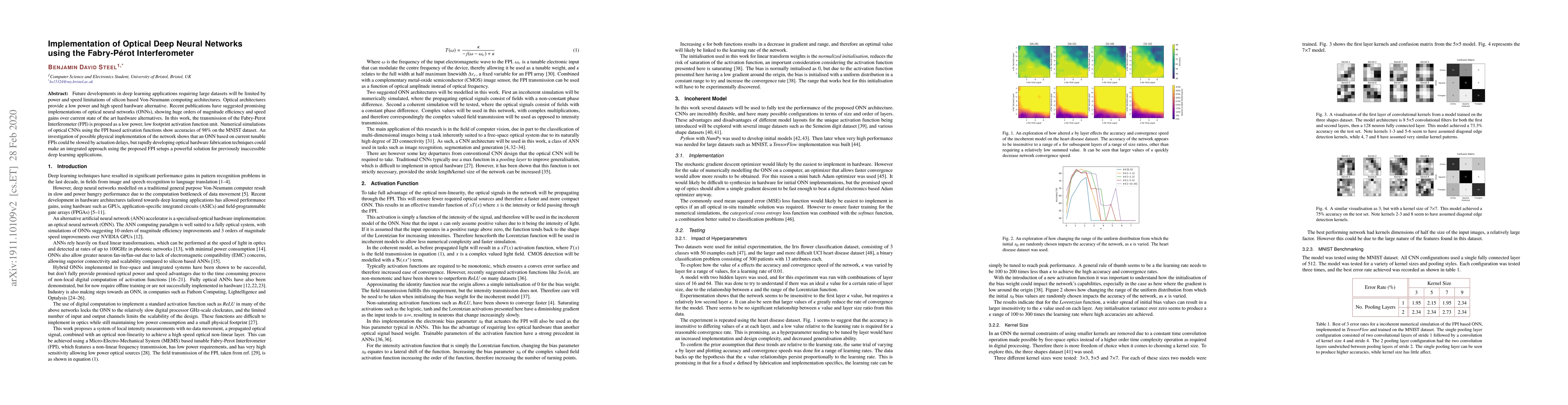 The research proposes the use of a Fabry-Perot Interferometer (FPI) as a low power, low footprint activation function unit in Optical Neural Networks (ONNs). Numerical simulations of optical CNNs using FPI-based activation functions were conducted, achieving 98% accuracy on the MNIST dataset.
