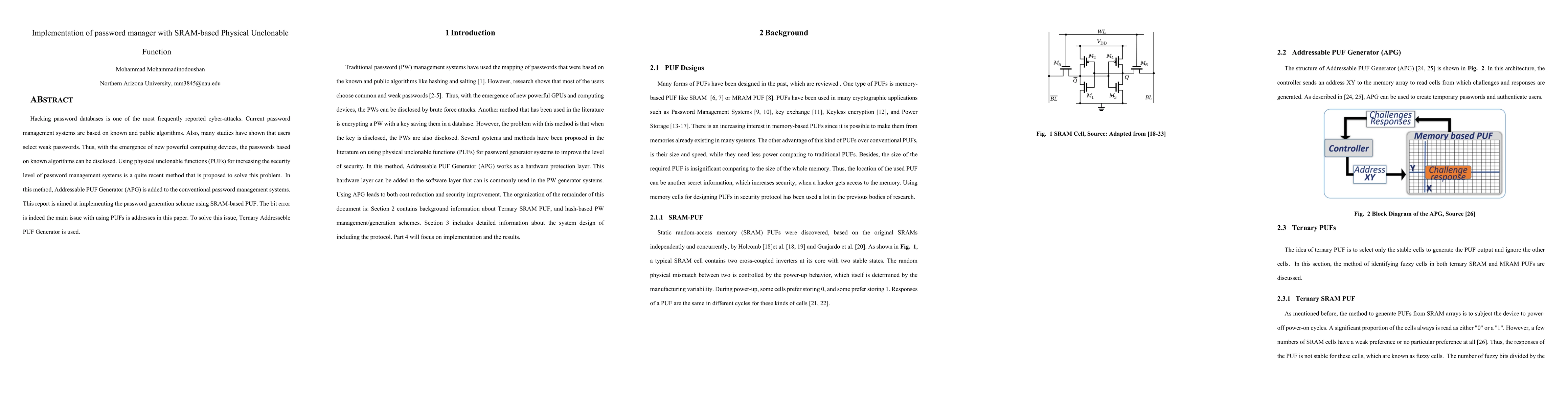 Hacking password databases is one of the most frequently reported cyber-attacks. Current password management systems are based on known and public algorithms. Also, many studies have shown that users select weak passwords. Thus, with the emergence of new powerful computing devices, the passwords based on known algorithms can be disclosed. Using physical unclonable functions (PUFs) for increasing the security level of password management systems is a quite recent method that is proposed to solve this problem. In this method, Addressable PUF Generator (APG) is added to the conventional password management systems. This report is aimed at implementing the password generation scheme using SRAM-based PUF. The bit error is indeed the main issue with using PUFs is addresses in this paper. To solve this issue, Ternary Addresseble PUF Generator is used.