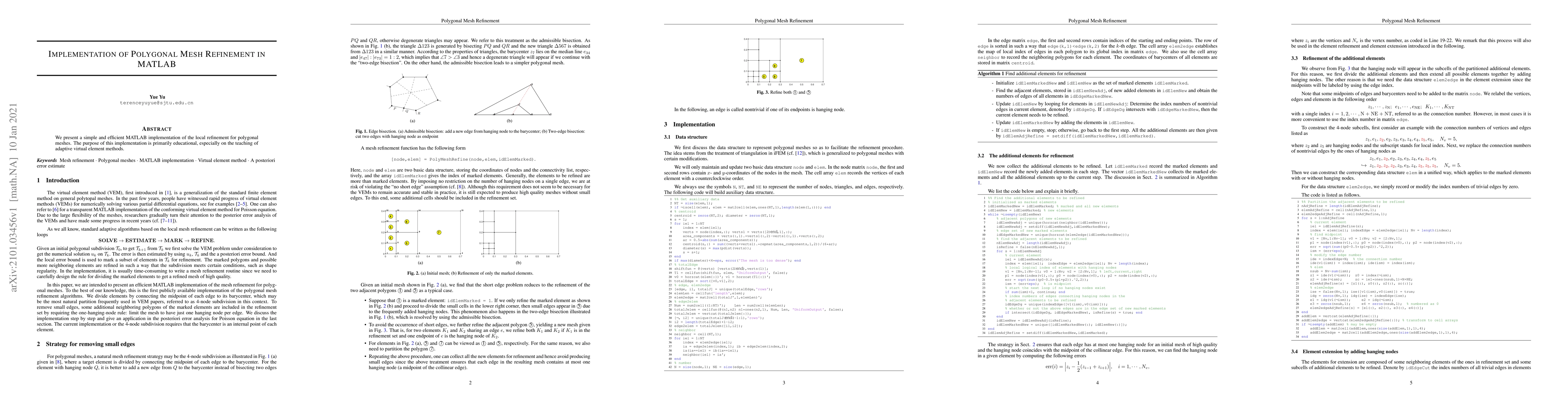 Summary: This paper details a MATLAB-based implementation of local refinement for polygonal meshes, aimed at enhancing educational value in teaching adaptive virtual element methods. The method is designed to be straightforward and efficient for instructional purposes.