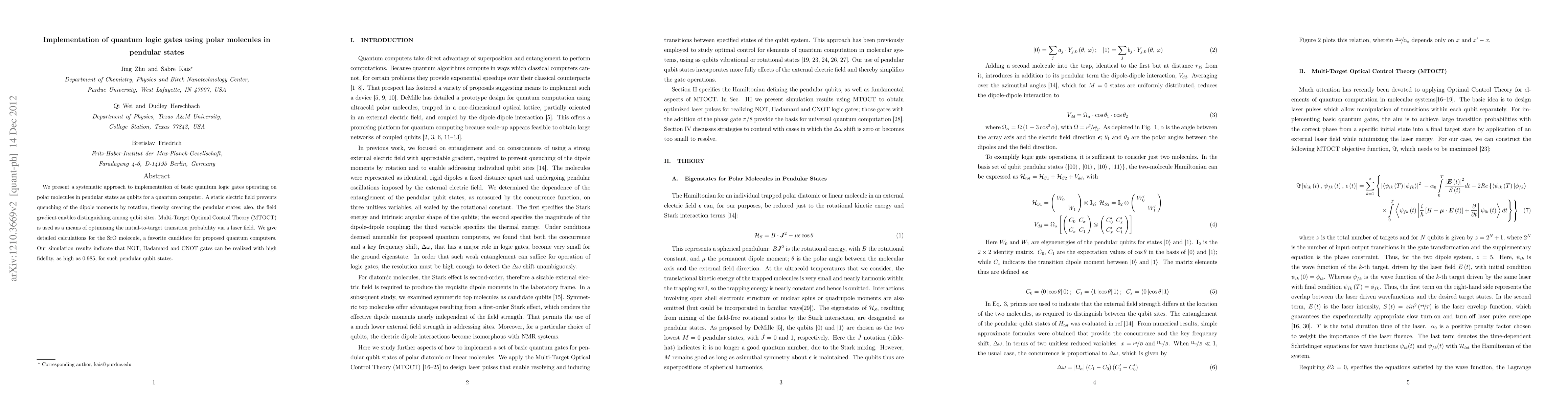 This paper proposes a method for implementing quantum logic gates using polar molecules in pendular states as qubits, utilizing a static electric field to maintain dipole moments and a laser field optimized via Multi-Target Optimal Control Theory. Simulation results show high fidelity realization of NOT, Hadamard, and CNOT gates for SrO molecules.