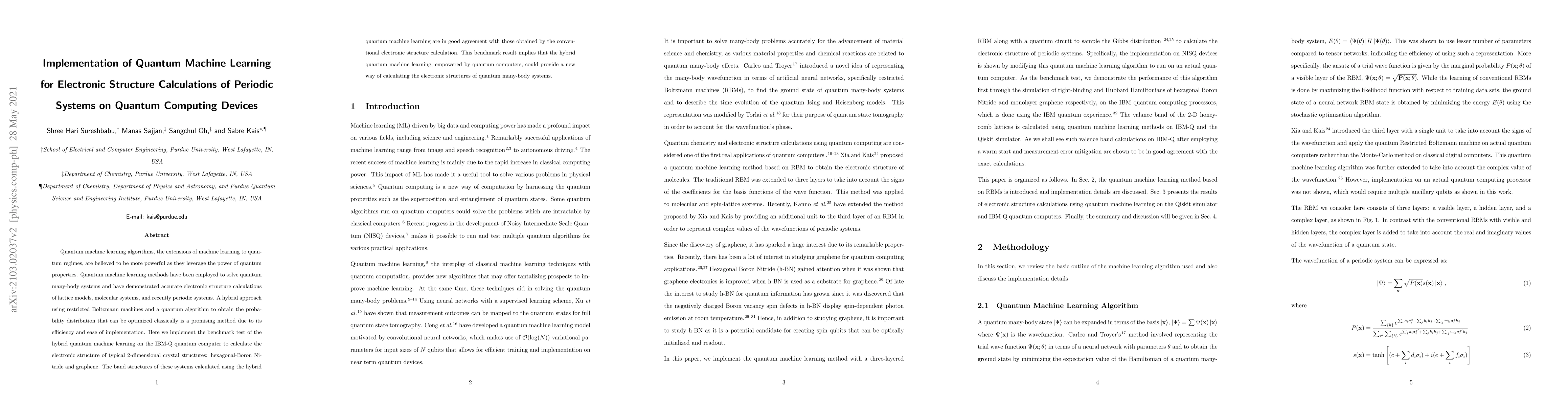 This paper implements a hybrid quantum machine learning approach on IBM-Q quantum computers to calculate electronic structures of 2-dimensional crystals like hexagonal-Boron Nitride and graphene. The results show good agreement with conventional methods, suggesting potential for quantum computing in electronic structure calculations.