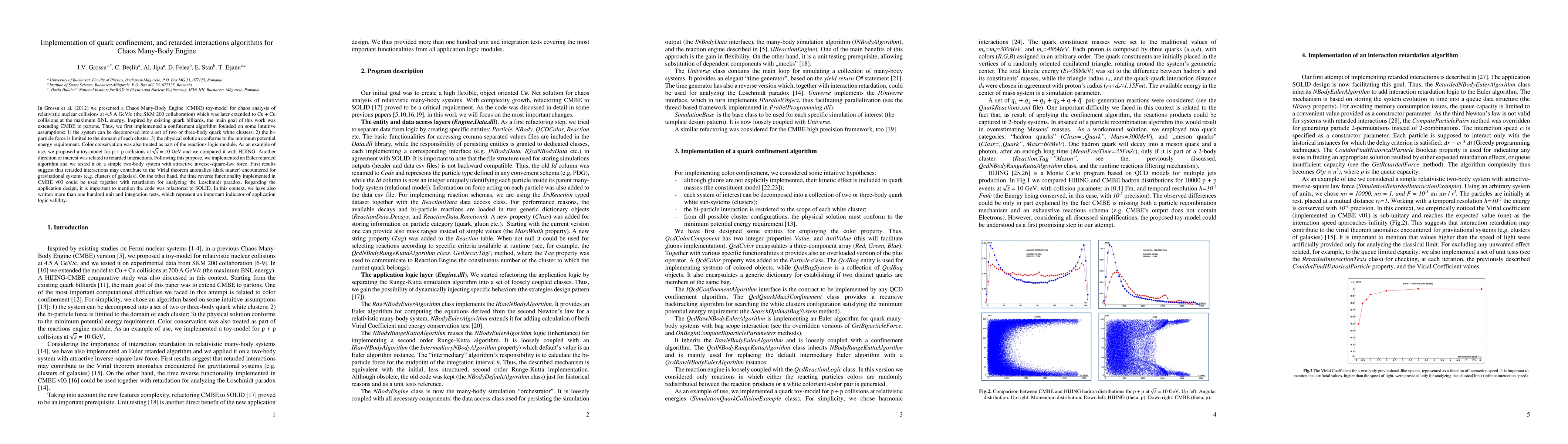 This research introduces an extended Chaos Many-Body Engine (CMBE) for analyzing parton interactions in relativistic nuclear collisions, incorporating quark confinement algorithms based on cluster decomposition and minimum energy principles. It also explores retarded interactions using an Euler algorithm, suggesting potential contributions to dark matter anomalies and Loschmidt paradox analysis. The application design was refactored to SOLID principles, accompanied by comprehensive unit and integration tests.