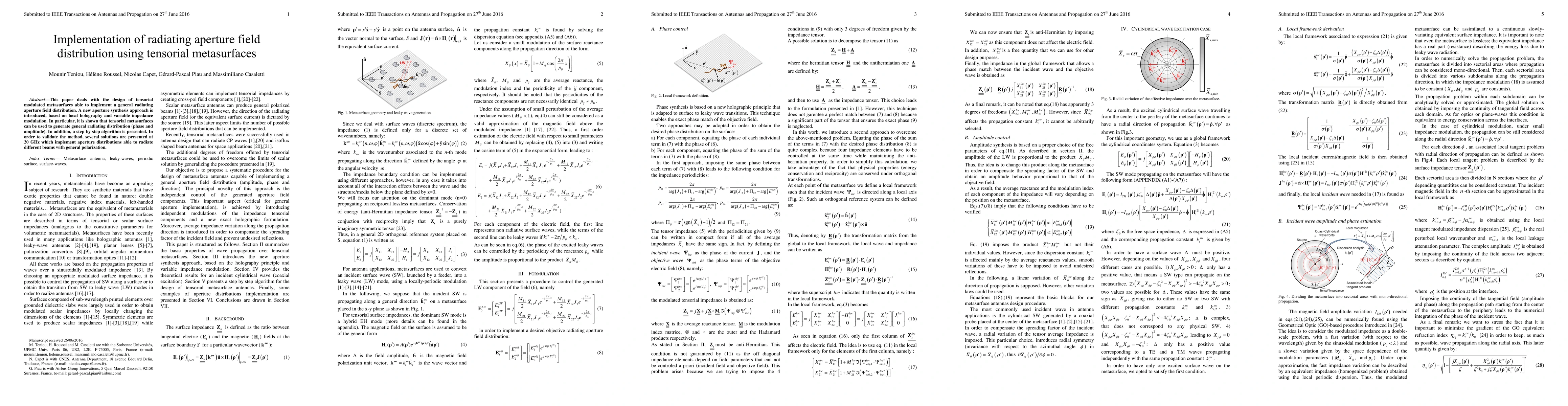 This paper introduces a novel aperture synthesis approach using tensorial modulated metasurfaces for implementing general radiating field distributions through local holography and variable impedance modulation. The proposed method is validated at 20 GHz with solutions generating different beams and polarizations.