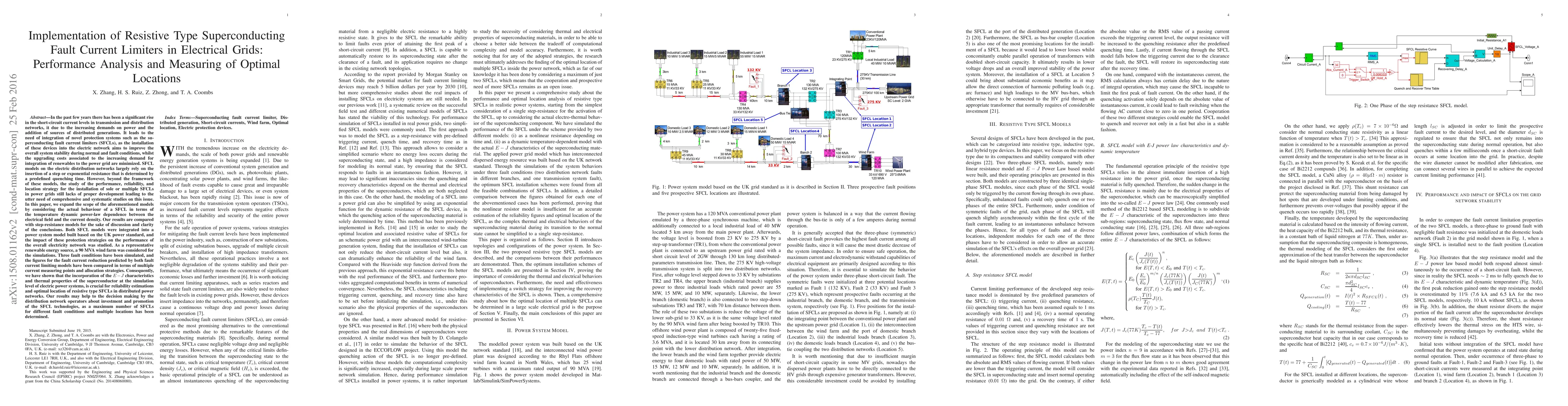 In the past few years there has been a significant rise in the short-circuit current levels in transmission and distribution networks, it due to the increasing demands on power and the addition of sources of distributed generations. It leads to the need of integration of novel protection systems such as the superconducting fault current limiters (SFCLs), ... . SFCL models on the electric distribution networks largely rely on the insertion of a step or exponential resistance that is determined by a predefined quenching time. However, beyond the framework of these models, the study of the performance, reliability, and location strategy for the installation of sole or multiple SFCLs in power grids still lacks of proper development leading to the utter need of comprehensive and systematic studies on this issue. In this paper, we expand the scope of the aforementioned models by considering the actual behaviour of a SFCL in terms of the temperature dynamic power-law dependence between the electrical field and the current density. Our results are compared with step-resistance models for the sake of discussion and clarity of the conclusions. Both SFCL models were integrated into a power system model built based on the UK power standard, and the impact of these protection strategies on the performance of the overall electricity network was studied. As a representative renewable energy source, a 90 MVA wind farm was considered for the simulations. Three fault conditions have been simulated, and the figures for the fault current reduction predicted by both fault current limiting models have been compared in terms of multiple current measuring points and allocation strategies...
