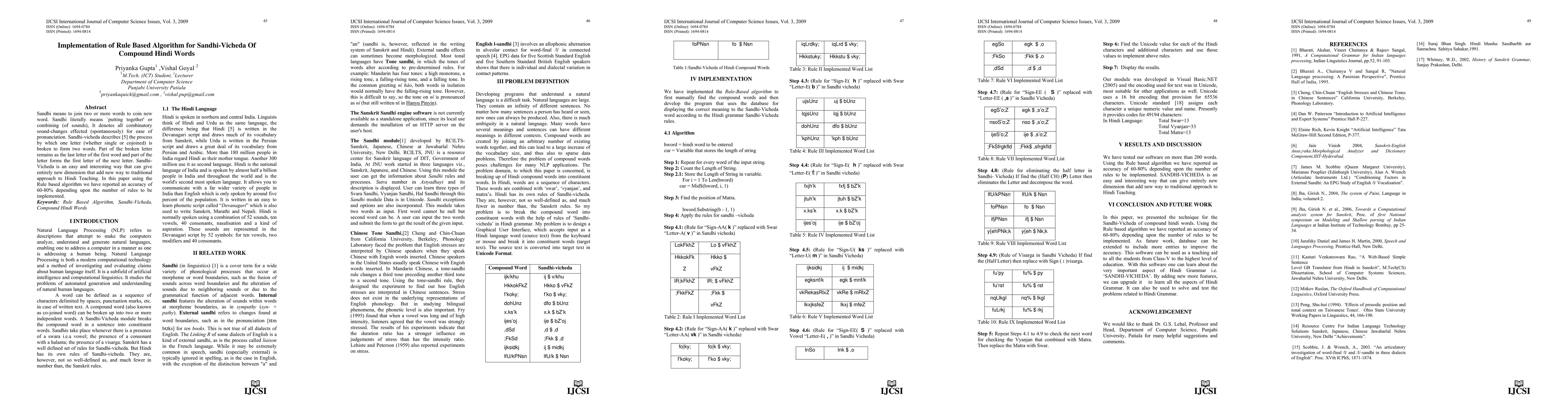 Sandhi means to join two or more words to coin new word. Sandhi literally means `putting together' or combining (of sounds), It denotes all combinatory sound-changes effected (spontaneously) for ease of pronunciation. Sandhi-vicheda describes [5] the process by which one letter (whether single or cojoined) is broken to form two words. Part of the broken letter remains as the last letter of the first word and part of the letter forms the first letter of the next letter. Sandhi- Vicheda is an easy and interesting way that can give entirely new dimension that add new way to traditional approach to Hindi Teaching. In this paper using the Rule based algorithm we have reported an accuracy of 60-80% depending upon the number of rules to be implemented.