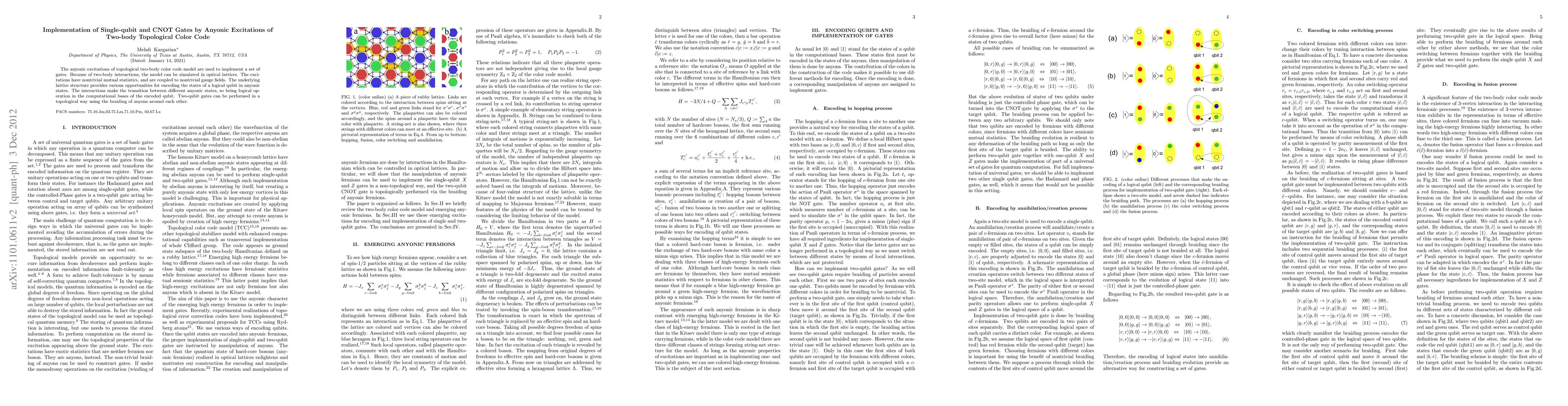 The anyonic excitations of topological two-body color code model are used to implement a set of gates. Because of two-body interactions, the model can be simulated in optical lattices. The excitations have nontrivial mutual statistics, and are coupled to nontrivial gauge fields. The underlying lattice structure provides various opportunities for encoding the states of a logical qubit in anyonic states. The interactions make the transition between different anyonic states, so being logical operation in the computational bases of the encoded qubit. Two-qubit gates can be performed in a topological way using the braiding of anyons around each other.