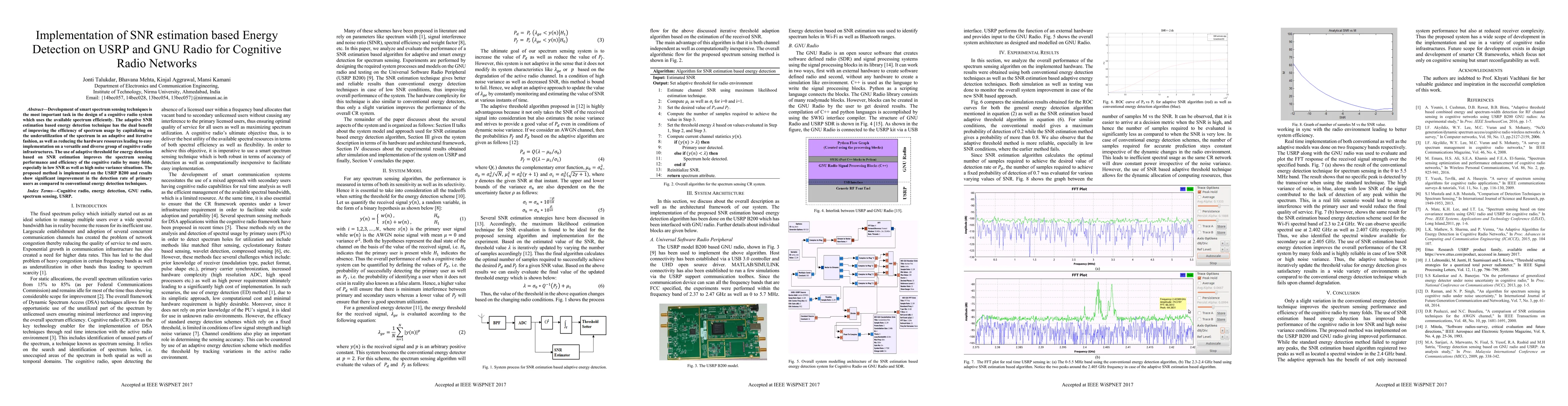 This research paper proposes an adaptive SNR estimation based energy detection technique for efficient spectrum sensing in cognitive radio networks, showing significant improvement over conventional methods on the USRP B200.